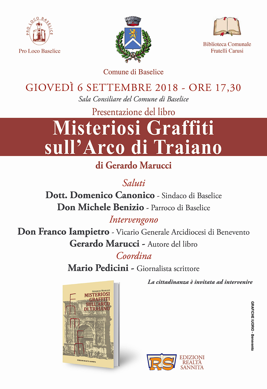 Baselice (Bn). Le Edizioni Realtà Sannita presentano il libro ”Misteriosi Graffiti sull’Arco di Traiano”