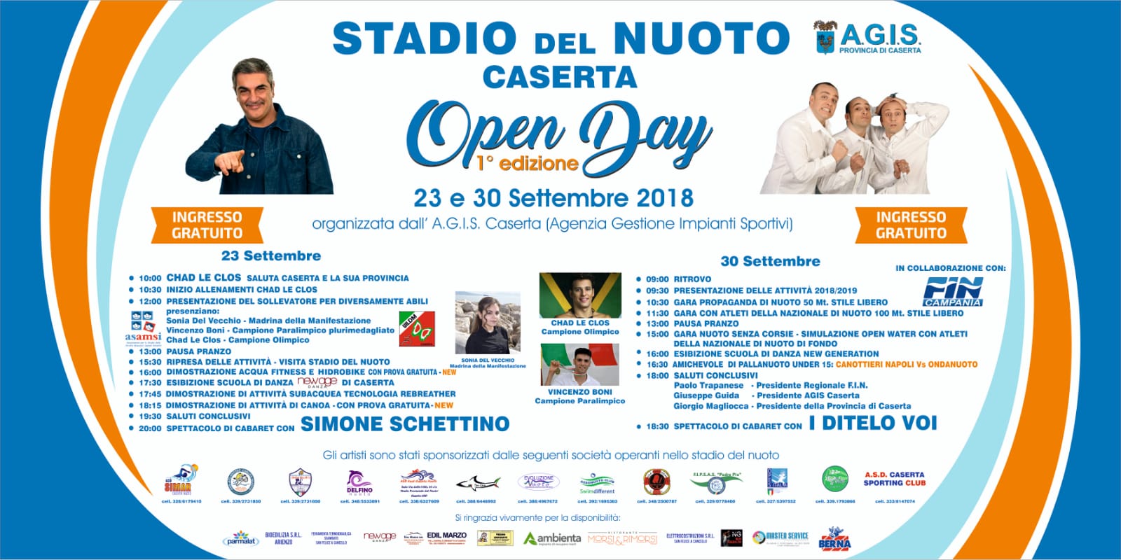 “Stadio del Nuoto di Caserta – Open Day 1° edizione – 23 e 30 Settembre 2018 “: due giornate all’insegna di un susseguirsi continuo di momenti sportivi e culturali, sapientemente alternati; nella prima giornata, si inizia con il saluto alla Città di Caserta ed alla Provincia di Caserta, quest’ultima proprietaria dello Stadio del Nuoto, da parte del nuotatore sudafricano, Chad Le Clos, Campione Olimpico dei 200 metri delfino alle Olimpiadi di Londra del 2012, per poi proseguire con la presentazione del sollevatore per diversamente abili, un apposito dispositivo, unico nel suo genere in Campania, che accompagna il diversamente abile nell’acqua, in totale sicurezza; presenziano: la Madrina della Manifestazione, Sonia del Vecchio, il Campione Paralimpico plurimedagliato, Vincenzo Boni ed il Campione Olimpico, Chad Le Clos. Si prosegue con varie dimostrazioni di specialità sportive, quindi, alle 20, in conclusione di questa prima giornata, lo spettacolo di Cabaret con Simone Schettino, famoso comico e cabarettista napolateno. Domenica 30 Settembre 2018 si inizia con la presentazione delle attività sportive in programma per il 2018/2019, varie gare di nuoto con la partecipazione di atleti della Nazionale di Nuoto 100 Mt. stile libero, poi una gara amichevole di pallanuoto under 15 (Canottieri Napoli Vs Ondanuoto), per proseguire con i saluti conclusivi del Presidente Regionale F.I.N., Paolo Trapanese, del Presidente dell’Agis, Giuseppe Guida, e del Presidente della Provincia, Giorgio Magliocca. In chiusura, ancora uno spettacolo di Cabaret, questa volta con la partecipazione del famoso trio comico napoletano “ I Ditelo Voi”, composto da Francesco De Fraia, Domenico Manfredi e Raffaele Ferrante, di Made in Sud.