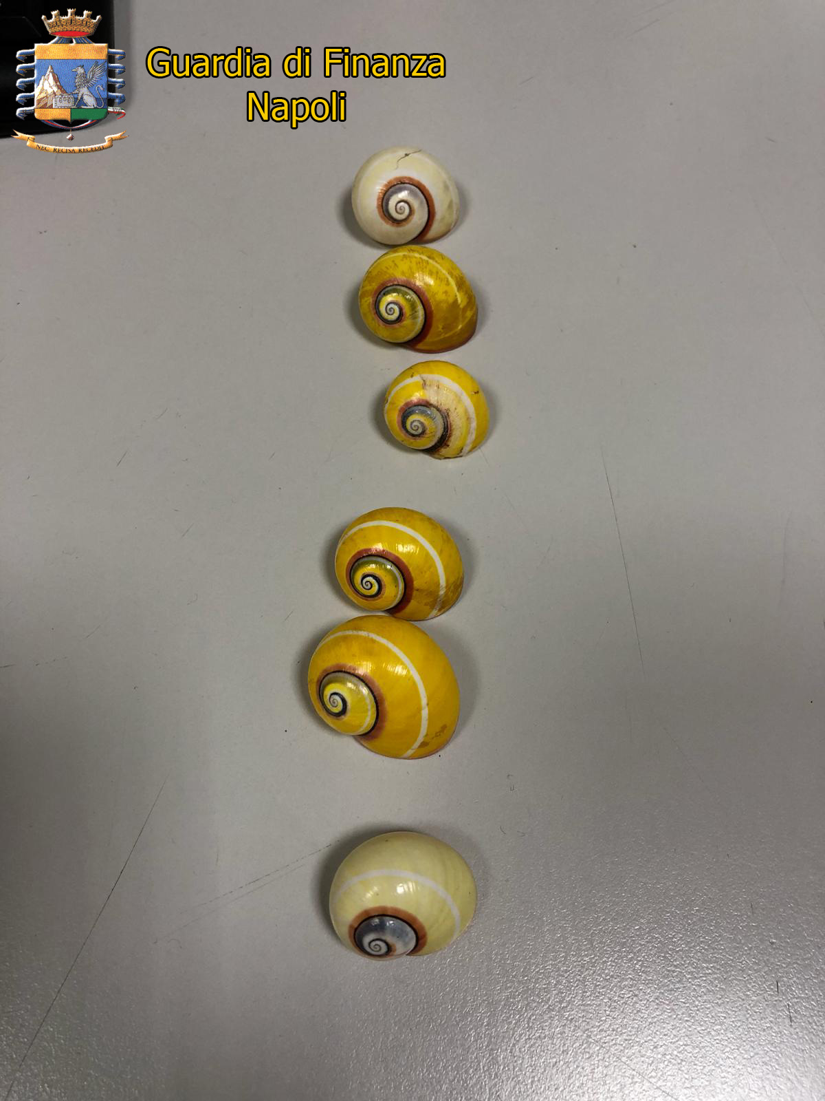 NAPOLI – Nel quadro dell’intensificazione del dispositivo di contrasto ai traffici illeciti in genere, con particolare attenzione alle aree di vigilanza doganale, i finanzieri del Comando Provinciale di Napoli, presso l’aeroporto di Capodichino, hanno sequestrato 6 esemplari di guscio di mollusco gasteropode, appartenenti al genere polymita picta, protette dalla convenzione di Washington.