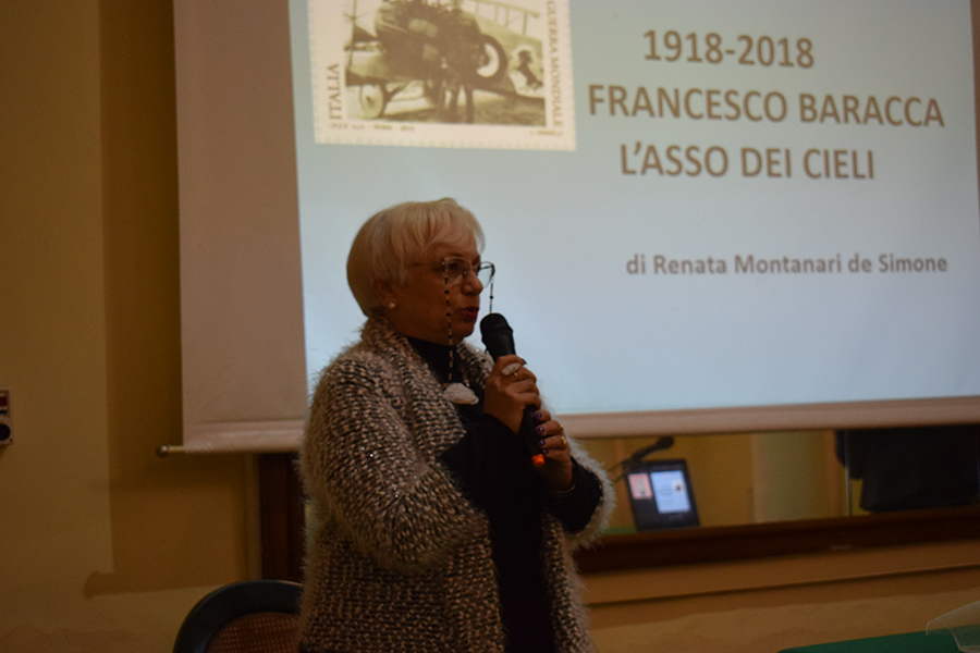 Dopo i saluti, è intervenuta la Prof.ssa Montanari che ha iniziato la propria esposizione sulla figura di Baracca. L’analisi effettuata dalla relatrice non si è soffermata su una sequenza temporale di fatti ed avventure di Baracca, ma attraverso le fonti storiche, ha presentato gli ideali, i sentimenti, le fragilità, ma anche l’audacia dell’uomo Baracca. Gentilezza, cavalleria, spirito di sacrificio, compassione, rispetto del nemico, amor di Patria sono i punti cardine per comprendere lo spirito di “Cecchino” – nomignolo con cui Baracca veniva chiamato dalla madre – asso con 34 velivoli abbattuti e comandante della 91a Squadriglia, passata alla storia come “La Squadriglia degl’Assi”.