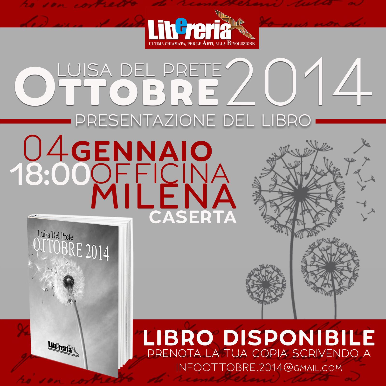 CASERTA. “Ognuno di noi vive sempre qualcosa che poi lo porterà ad una destinazione ben precisa”. Questa la frase centrale che si legge nella prefazione al libro esordio ‘Ottobre 2014’ della scrittrice Luisa Del Prete, che sarà presentato presso l’Officina Milena a Caserta, in via San Carlo alle ore 18.