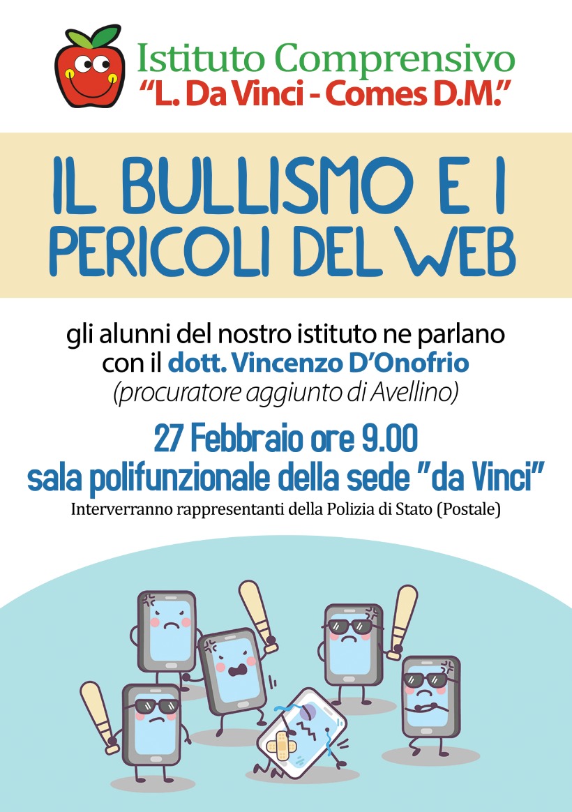 Mercoledì 27 febbraio, dalle 9.00 alle 12.00, presso l’Istituto comprensivo “L. da Vinci Comes D.M.” di Portici, sito in viale Bernini si terrà una conferenza stampa il cui tema portante sarà “il fenomeno del bullismo e i pericoli del web”. La Preside della Scuola, la Dott. ssa Fabiana Esposito ha così presentato l’evento:
