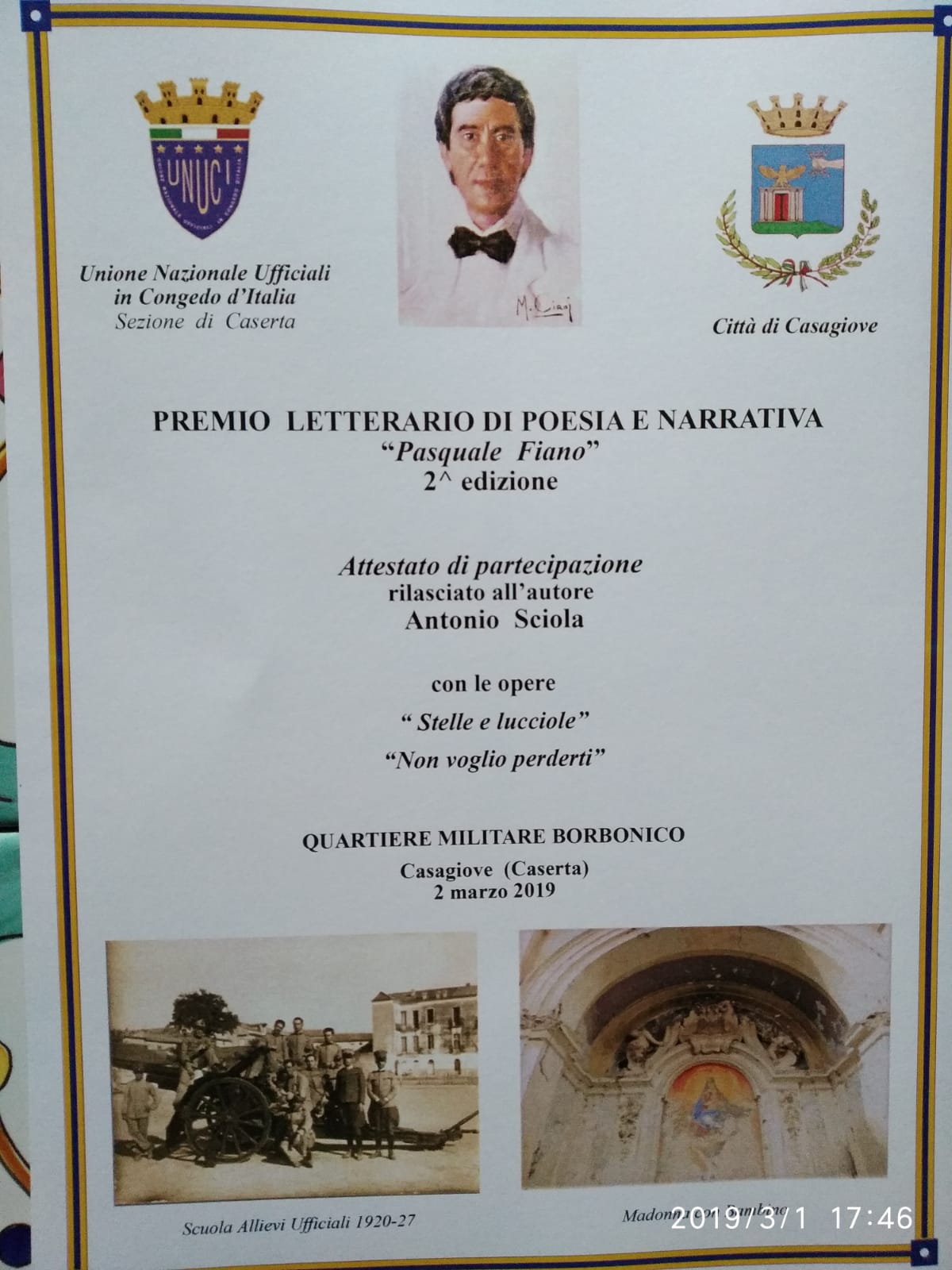 La manifestazione si terrà sabato 2 marzo 2019, presso il salone del Quartiere militare borbonico a partire dalle ore 17.30. Il premio letterario gode del patrocinio del Comune di Casagiove e dell’Unione Nazionale Ufficiali in Congedo d’Italia.
