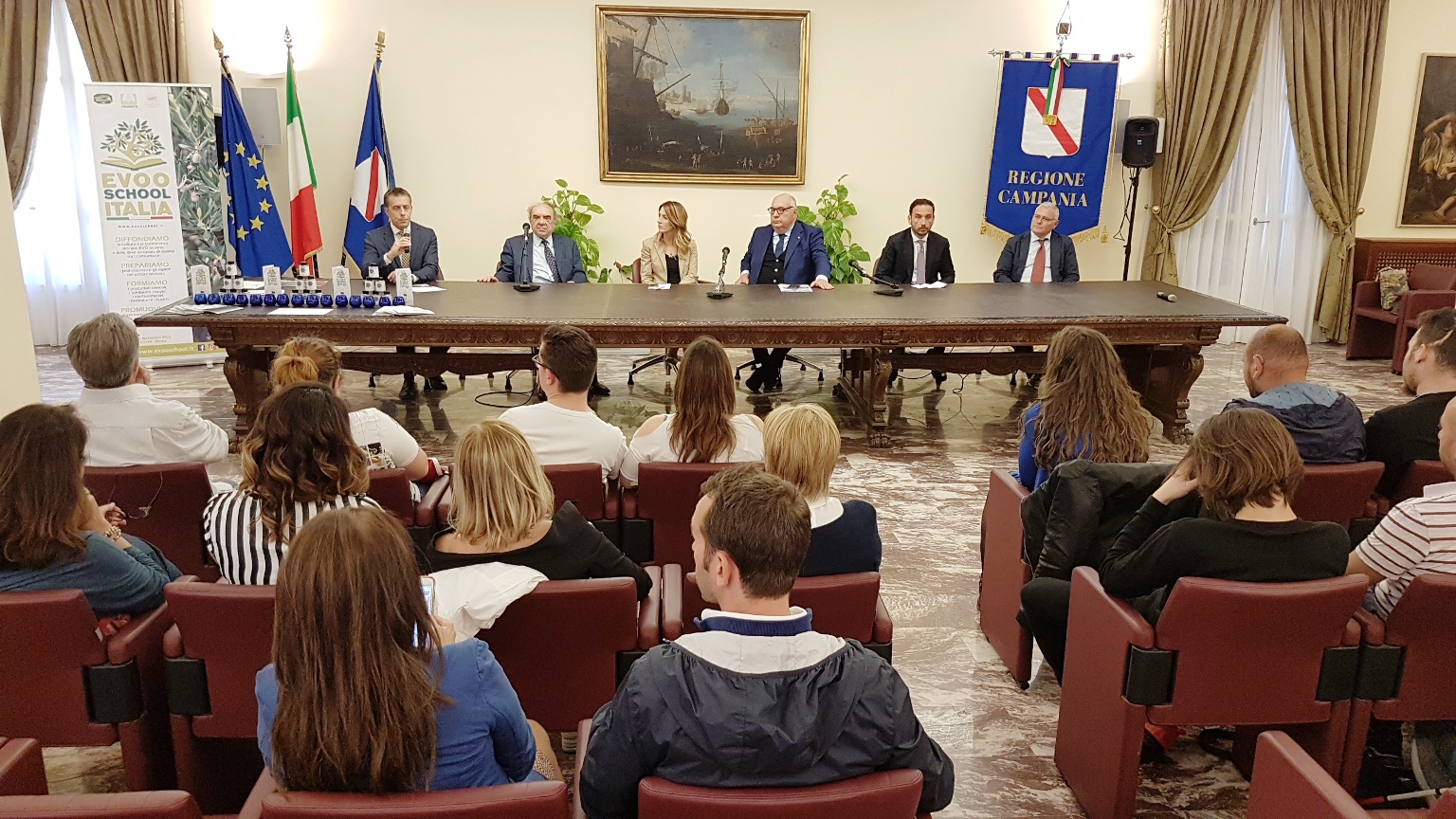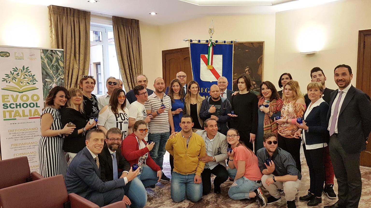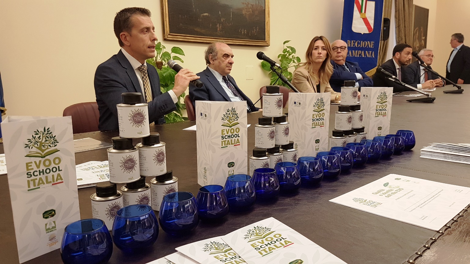 Presenti il vicepresidente nazionale di Coldiretti, presidente di Coldiretti Lazio e presidente di Unaprol David Granieri, l’assessore alla formazione della Regione Campania Chiara Marciani, il direttore di Coldiretti Campania Salvatore Loffreda, il direttore di Coldiretti Lazio Sara Paraluppi, il responsabile della Evoo School di Coldiretti Nicola Di Noia, il coordinatore di Aprol Campania Giuseppe Miselli. Agli studenti sono stati regalati il bicchierino blu degli assaggiatori e un campione di 100 ml di olio evo offerto da Aprol Campania.