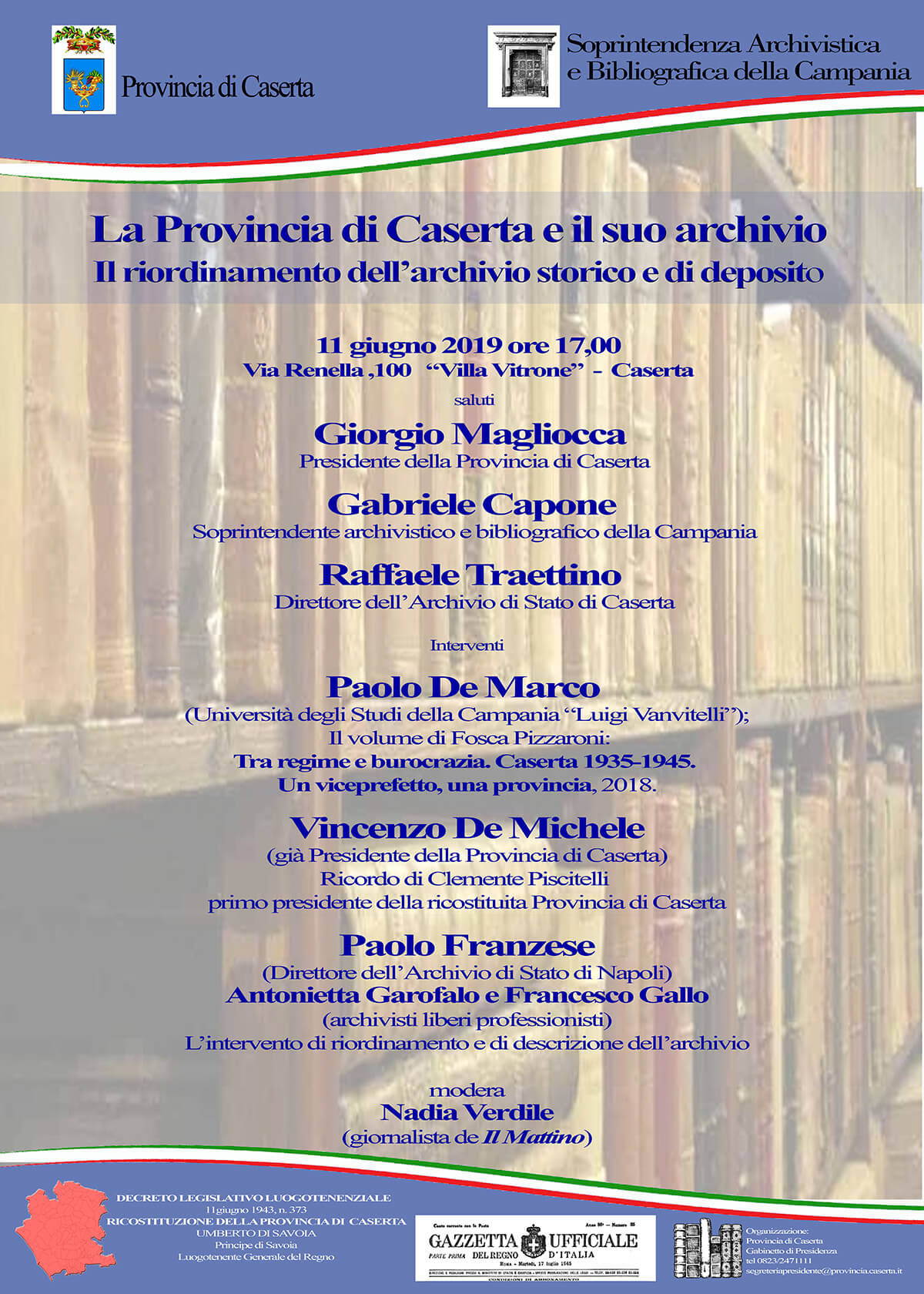 Martedì 11 Giugno 2019, alle ore 17,00 nella Sala Convegno di Villa Vitrone a Caserta, si terrà un incontro pubblico sul tema: “La Provincia di Caserta ed il suo archivio – Il riordinamento dell’archivio storico e di deposito”. Dopo i saluti del Presidente della Provincia, Giorgio Magliocca, del Soprintendente archivistico e bibliografico della Campania , Gabriele Capone, e del Direttore dell’Archivio di Stato di Caserta, Raffaele Traettino, interverranno il professor Paolo de Marco dell’Università degli Studi della Campania “Luigi Vanvitelli”, che illustrerà il volume di Fosca Pizzaroni: “Tra regime e burocrazia. Caserta 1935-1945. Un viceprefetto, una provincia, 2018”, poi il già Presidente della Provincia di Caserta, Vincenzo de Michele, che tratterà il tema: Ricordo di Clemente Piscitelli, primo presidente della ricostituita Provincia di Caserta.