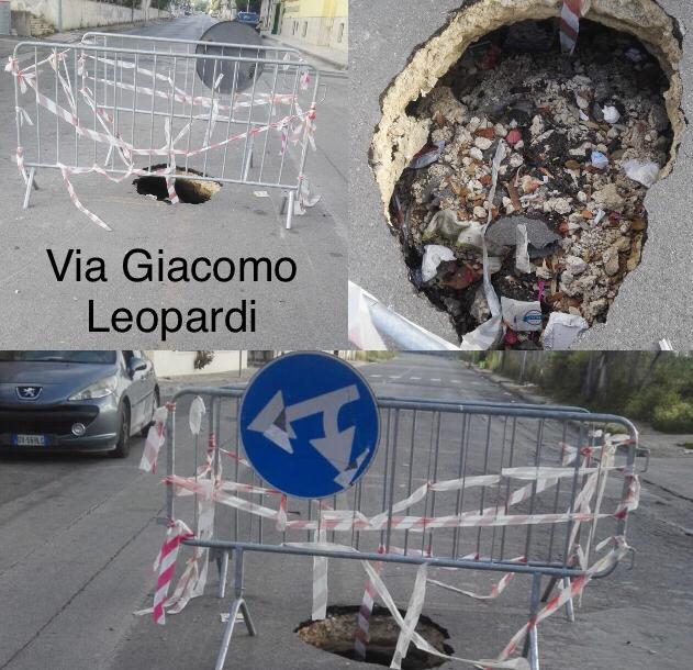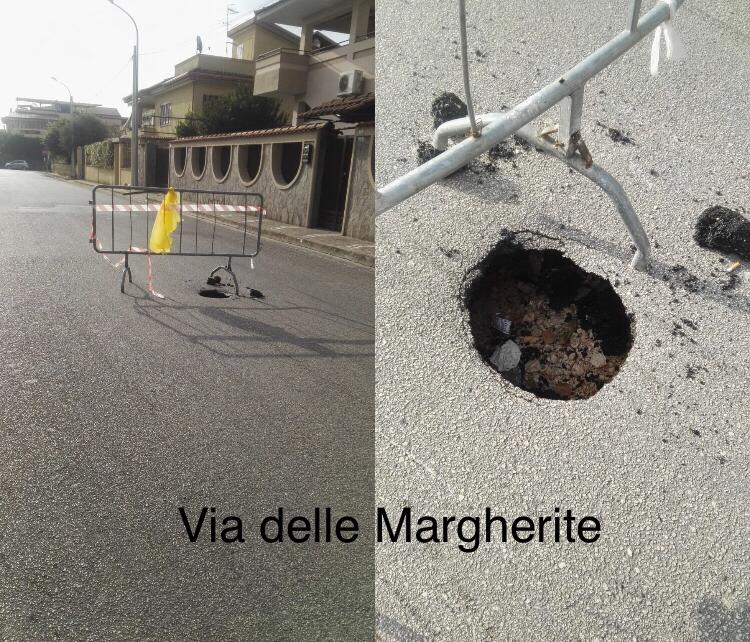 Le strade immortalate sono via delle Margherite, via Boccaccio e via Giacomo Leopardi. In via delle Margherite, altamente trafficata per il diretto collegamento con la vicina Trentola Ducenta e gli svincoli autostradali, è stata posta una transenna, coperta in malo modo da una busta gialla, a segnalazione della voragine sottostante. In via Giovanni Boccaccio, invece, in prossimità delle scuole elementari e del piazzale omonimo, la buca originatasi è stata colmata con pezzi di legno tagliati ad hoc. In via Giacomo Leopardi, dove si tiene settimanalmente la fiera settimanale, la falla ha raggiunto diametro e profondità molto preoccupanti. In questo caso sulla transenna è stato posto un segnale stradale non pertinente.