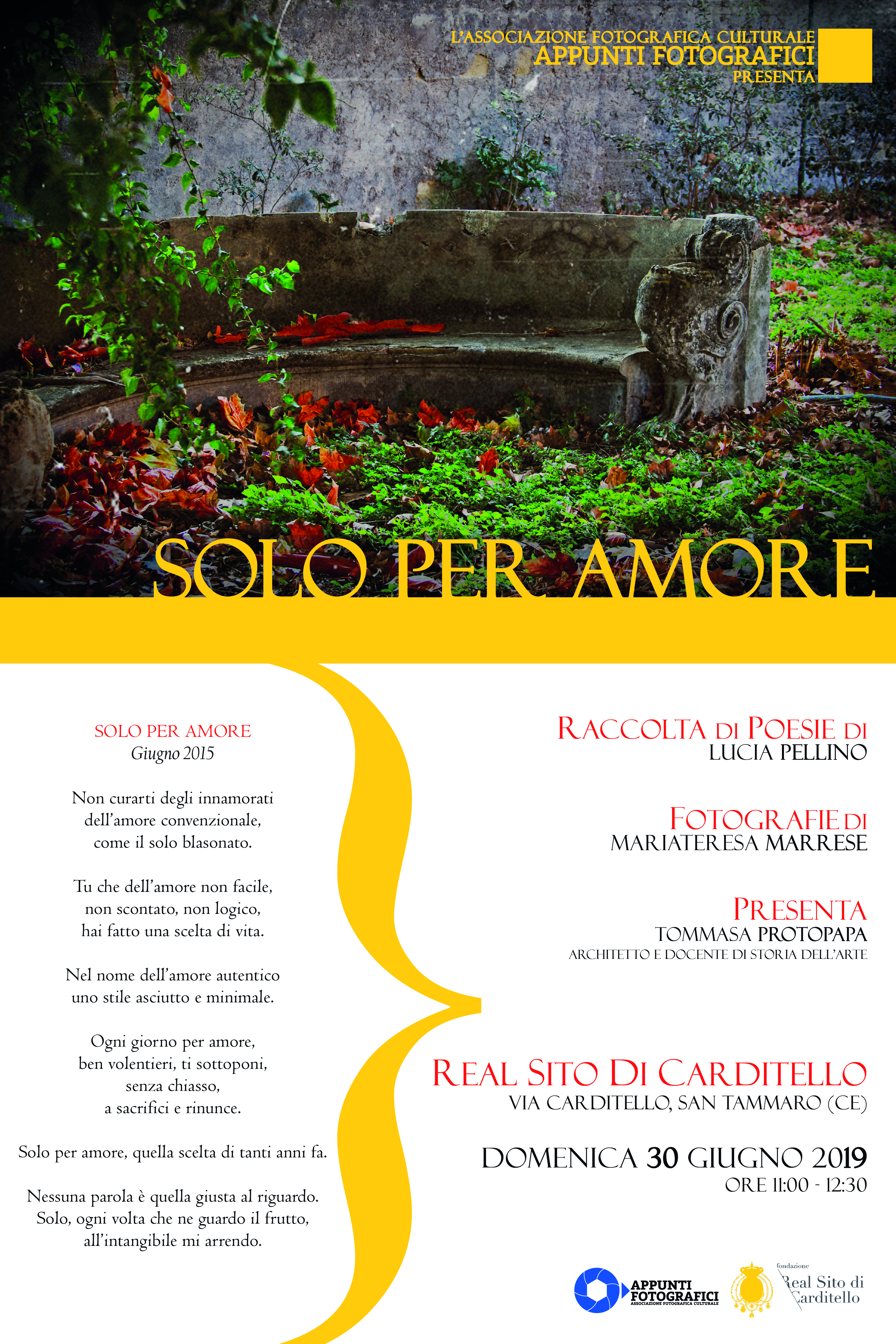 Nuovamente protagonista di una splendida mostra l’associazione capuana “Appunti Fotografici” presenta una meravigliosa raccolta di fotografie di Mariateresa Marrese dal titolo “Solo per Amore”. Teatro dell’evento lo storico Real Sito di Carditello a San Tammaro, la residenza voluta da Ferdinando IV di Borbone nel 1787, nell’area individuata già alla metà del XVIII secolo da Carlo di Borbone e destinata all’allevamento, alla selezione di cavalli di razza reale e alla produzione agricola e casearia, che domenica 30 giugno 2019 alle ore 11 aprirà i battenti ad un incontro con la fotografia. Durante l’evento ci sarà un momento dedicato alla poesia con Lucia Pellino mentre la presentazione è affidata a Tommasa Protopapa, architetto e docente di Storia dell’Arte. L’esposizione prosegue il dialogo e l’intreccio tra moti dell’anima, sensazioni, sentimenti immortalati da un obiettivo fotografico da parte di chi ha fatto della fotografia una vera e propria passione di vita. L’Associazione “Appunti Fotografici”, sin dalla sua nascita, è attiva sul territorio nell’organizzazione di mostre fotografiche, conversazioni fotografiche ed è nata qualche anno fa da un gruppo di giovani incontratisi su un social network, accomunati dalla passione per l’obiettivo. L’Associazione organizza altresì corsi di fotografia, corsi di post produzione, workshop, uscite fotografiche, serate culturali. Appuntamento a domenica 30 giugno allora.