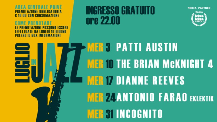 Luglio in jazz è un appuntamento consolidato nel panorama musicale italiano. Negli anni sul Palco di Piazza Campania si sono esibiti artisti di fama mondiale accompagnati da strumentisti di grandissimo livello. Il jazz è un genere ormai amato da tutti che avvicina sempre nuovi appassionati grazie a una grande varietà di tendenze musicali e di artisti poliedrici.