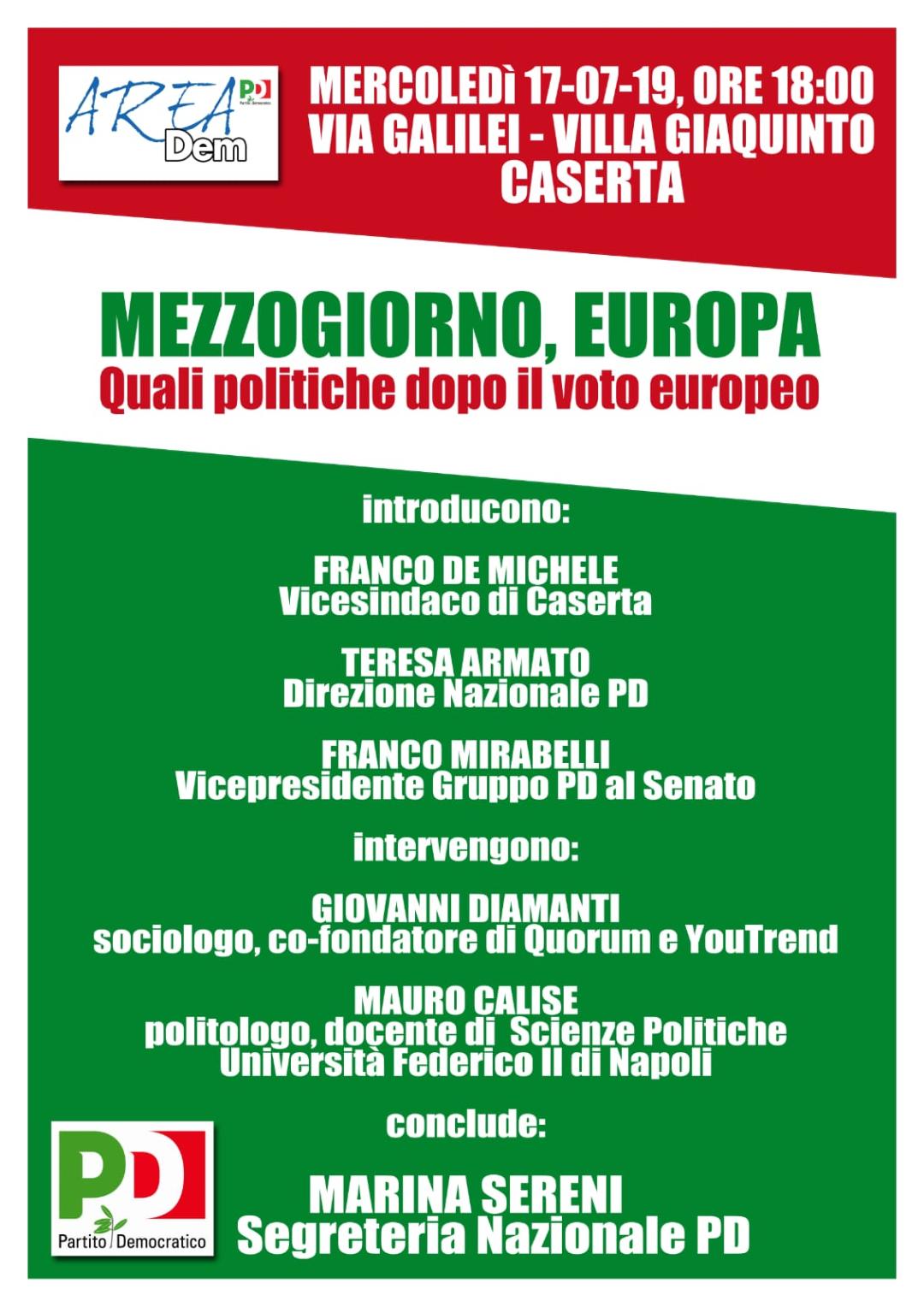 Mercoledì 17 luglio alle ore 18.00 si terrà l’incontro “Mezzogiorno, Europa. Quali politiche dopo il voto europeo” presso la Villa Giaquinto in Via Galilei a Caserta.