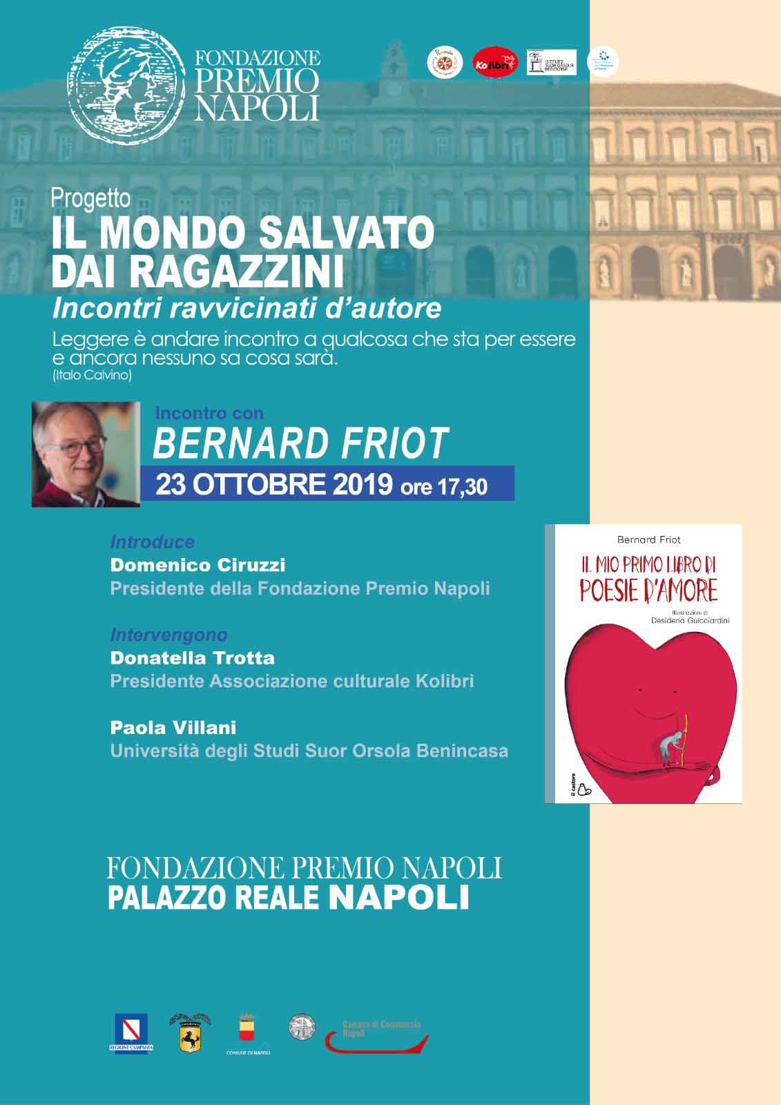 La Fondazione Premio Napoli adotta il progetto procidano “Il mondo salvato dai ragazzini”, ideato dall’Associazione culturale Kolibrì Napoli, e apre le porte alla Civiltà dell’Infanzia con quattro appuntamenti autunnali nel segno della Children’s Literature e un evento finale a dicembre, rivolto a oltre 600 giovani giudici-lettori delle scuole medie di Napoli e provincia, in attesa del Bando Ragazzi per l’edizione 2020. Primo appuntamento, mercoledì il 23 ottobre ore 17.30, presso la sede della Fondazione a Palazzo Reale, con Bernard Friot: insignito a Genova del Premio Andersen 2019 come “Protagonista della cultura dell’infanzia”.