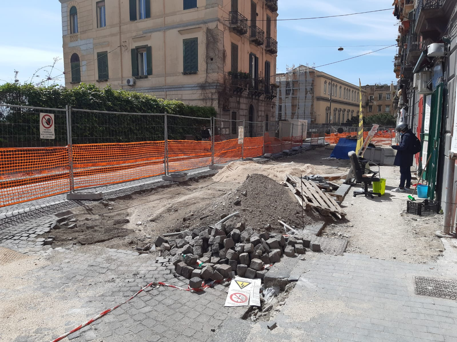 Resta ancora fermo il cantiere per la sostituzione dei sampietrini con l’asfalto al Corso Vittorio Emanuele, come documentato dal Consigliere Regionale dei Verdi Francesco Emilio Borrelli, così come quello della metropolitana in via Alessandro Poerio, come segnalato da un cittadino.