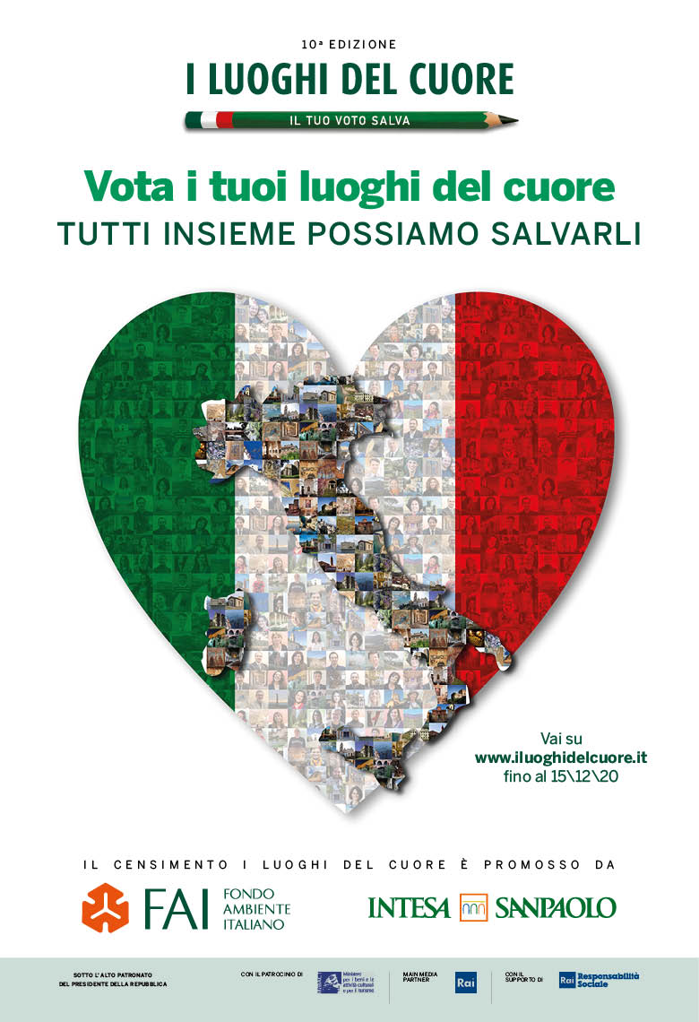 Ha preso il via oggi con una presentazione alla stampa via webinar – a cui hanno partecipato, tra gli altri, il Presidente FAI Andrea Carandini, il Vicepresidente Esecutivo FAI Marco Magnifico e il Sottosegretario al Ministero per i beni e le attività culturali e il turismo Anna Laura Orrico – la decima edizione del censimento “I Luoghi del Cuore” promosso dal FAI – Fondo Ambiente Italiano in collaborazione con Intesa Sanpaolo. Da oggi al 15 dicembre 2020 tutti i cittadini, nei piccoli borghi e nelle grandi città, nei paesi meno conosciuti e in quelli più noti, in Italia ma anche all’estero, avranno la possibilità di votare i luoghi italiani che amano di più e vorrebbero vedere tutelati e valorizzati.