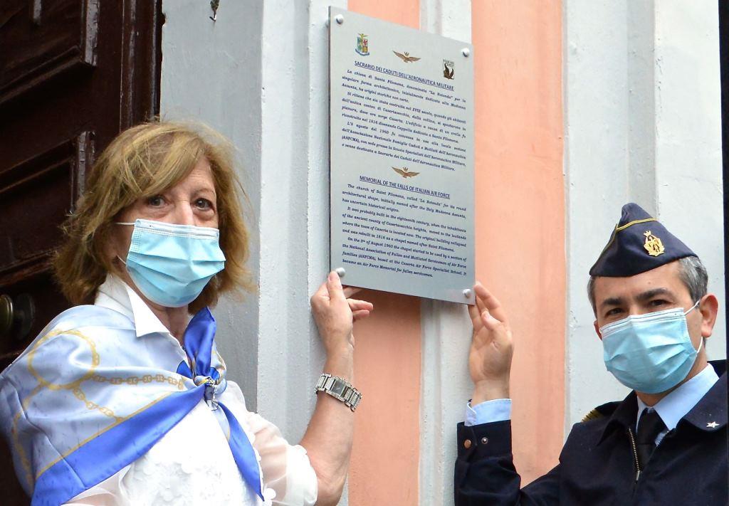 La targa esplicativa – scoperta nella mattina di pioggia di venerdì 5 giugno dal Comandante della Scuola Specialisti e dalla Presidente locale dell’Associazione Nazionale Famiglie Caduti e Mutilati dell’Aeronautica – riporta, in italiano e inglese, a favore dei turisti stranieri, brevi cenni storici della chiesa di Santa Filomena che, denominata “La Rotonda” per la singolare forma architettonica ed inizialmente dedicata al culto della Madonna Assunta, ha origini storiche non certe.