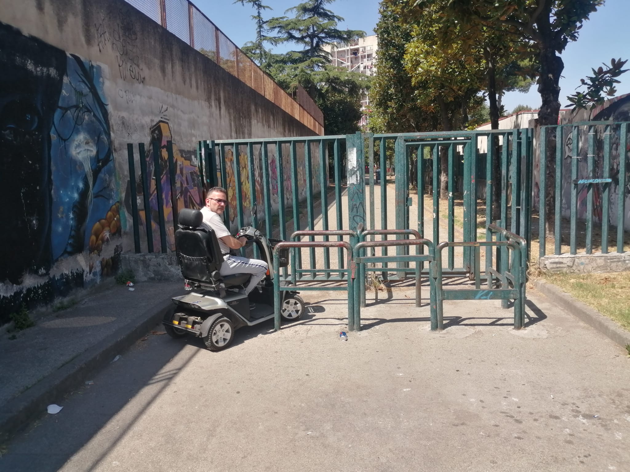 “Un cittadino di Ponticelli ci ha segnalato le difficoltà enormi che suo padre, disabile, deve affrontare ogni giorno solo per potersi spostare. La periferia Est di Napoli, ci dice, è invasa da barriere architettoniche che rendono difficile anche i più semplici spostamenti. ‘Non siamo liberi’, dice ‘Una persona invalida ha il diritto di sentirsi libera come un comune cittadino’. La sua denuncia mostra una zona commerciale dove, a causa di alcuni paletti installati per evitare la sosta selvaggia, per le persone in carrozzina è impossibile transitare. Questa è la dimostrazione di come l’inciviltà di certa gente, che si sente in diritto di parcheggiare auto e scooter anche sui marciapiedi e di transitare ovunque in modo selvaggio , crei danni alla vita della comunità. Stesso discorso per la villa comunale “De Simone”, il cui ingresso è praticamente “interdetto” alle sedie a rotelle perché troppo stretto e, quasi sempre, bloccato da macchine parcheggiate.