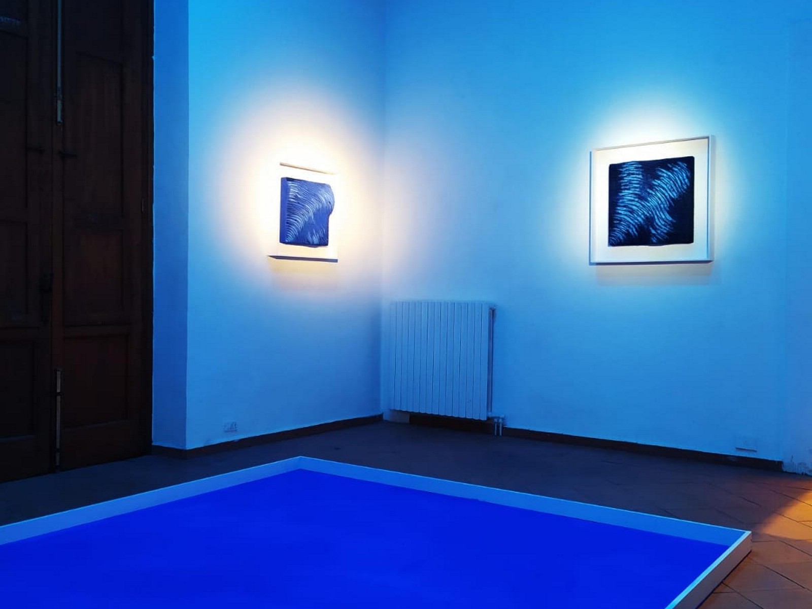 La forma poetica del suo linguaggio è pura. Le cromie, pure. Il suo è uno spazio d’introspezione, costruito su una scala di accordi tonali, fra il gioco a parete delle superfici estroflesse e la grande istallazione, al centro della sala, che raccoglie dal Marocco pigmenti di colore blu. S
