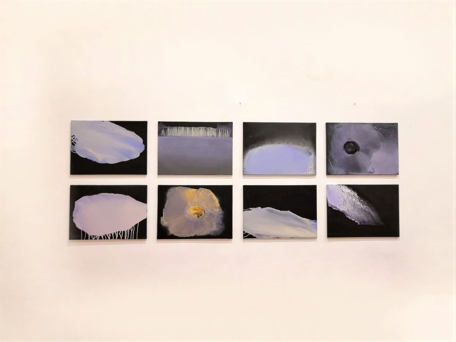Cinque artisti per cinque sensi, in un’immersione totale e totalizzante. Cinque artisti per cinque atmosfere, con la possibilità di coglierne infinite, riconciliando la coscienza, interna a noi, e il mondo, intorno a noi. «Del resto – aggiunge Giovinale –, i moti dell’anima, scriverà Martin Heidegger, “sono tessuti atmosferici”, nelle cui trame si muove l’arte, si muove la vita». Forme fluide allo sguardo si addensano sulla tela di Luigi Pagano, eludendo il tempo nel suo verso lineare e circolare. L’opera si compie attraverso una profonda narcosi creativa. Pagano si nuove come un rabdomante, portando in superficie atmosfere alchemiche di tonalità di blu affioranti dal nero e di luci dischiuse, come squarci nel bianco albedo.
