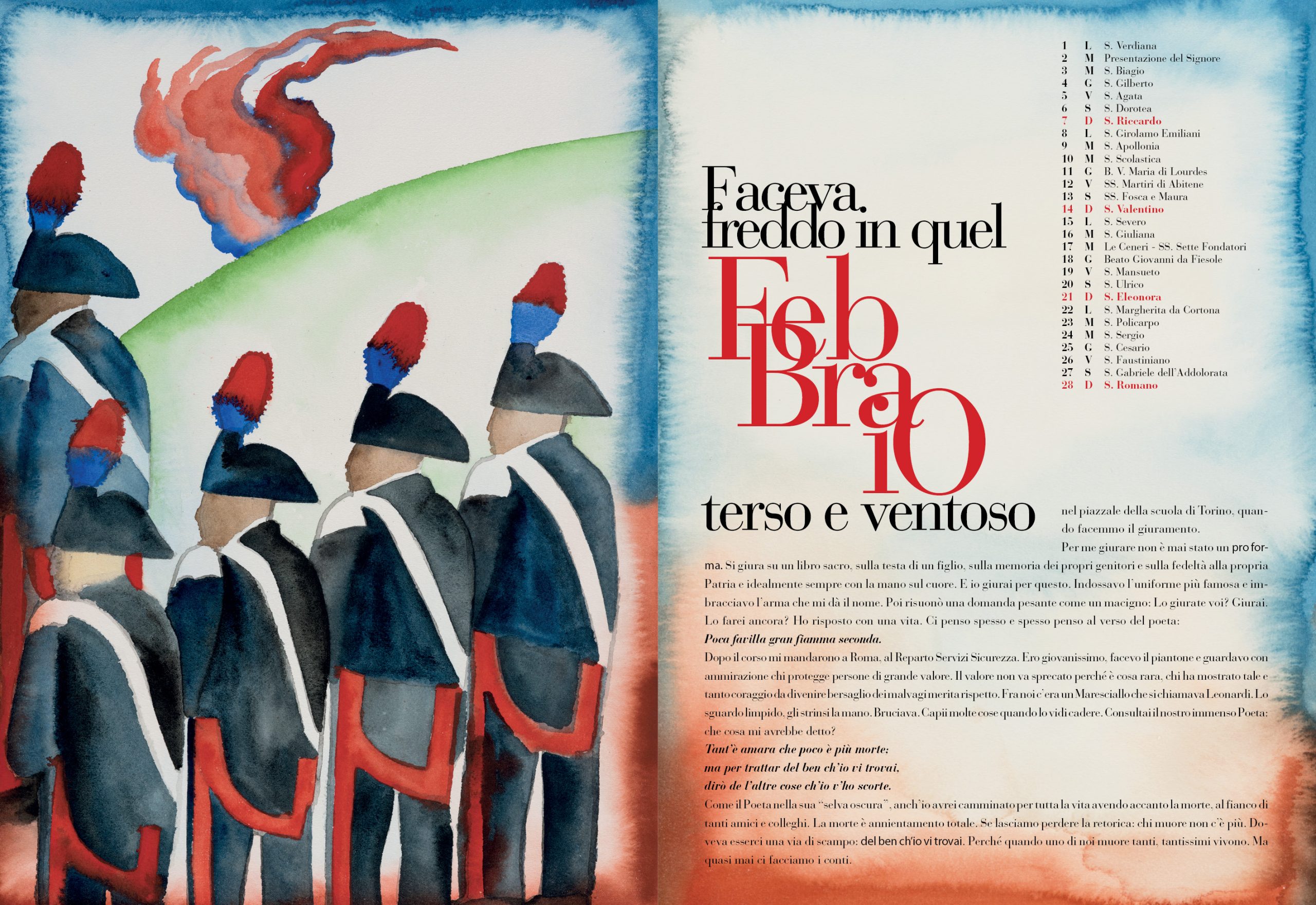 Per il Calendario Storico del 2021, 1’ Arma dei Carabinieri si è affidata alla penna di Valerio Massimo Manfredi, cantore e custode della storia antica, e alle tavole realizzate da un esponente della Transavanguardia italiana, Francesco Clemente.