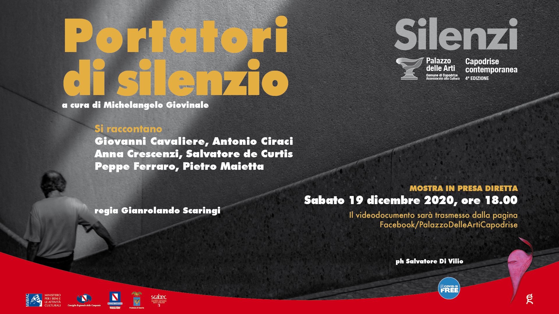 “Portatori di silenzio” incrocia le esperienze artistiche di Salvatore de Curtis, Giovanni Cavaliere, Antonio Ciraci, Peppe Ferraro, Anna Crescenzi e Pietro Maietta.