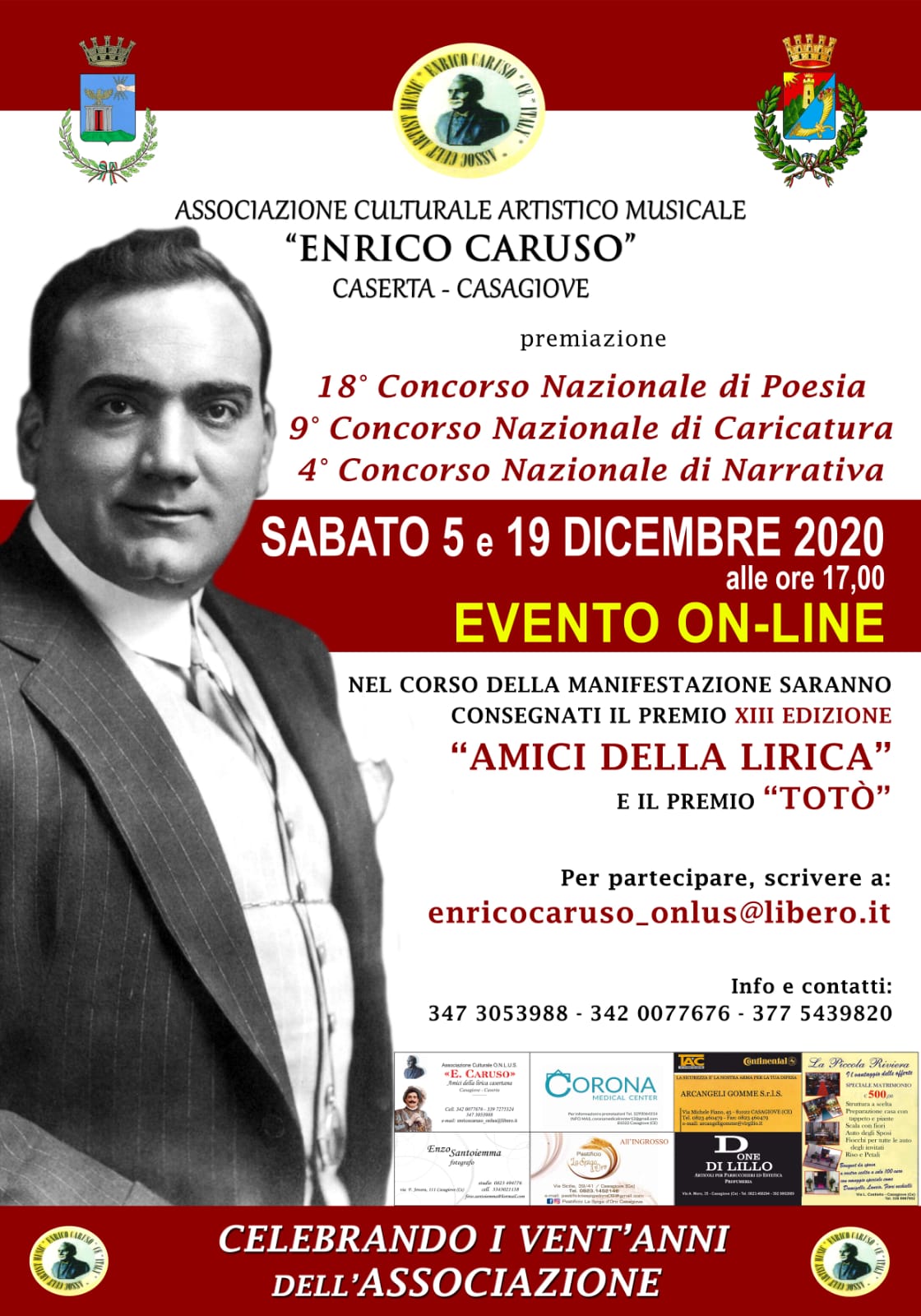 Cresce l’attesa per il nuovo appuntamento dell’Associazione “E. Caruso” di Caserta e Casagiove, nell’ambito delle celebrazioni per il ventennale. Infatti, dopo la prima serata, svoltasi online il giorno sabato 5 dicembre, con grande successo di pubblico, il prossimo 19 dicembre 2020, sempre alle ore 17,00, si svolgerà la seconda serata della premiazione del 18° concorso nazionale di poesia, del 9° concorso nazionale di caricatura e del 4° concorso nazionale di narrativa, del premio Amici della lirica e del premio Totò, manifestazione patrocinata dai comuni di Casagiove e di Caserta, continuando nel solco delle grandi manifestazioni culturali organizzate dall’Associazione “E. Caruso”, che porta il nome del re dei tenori.