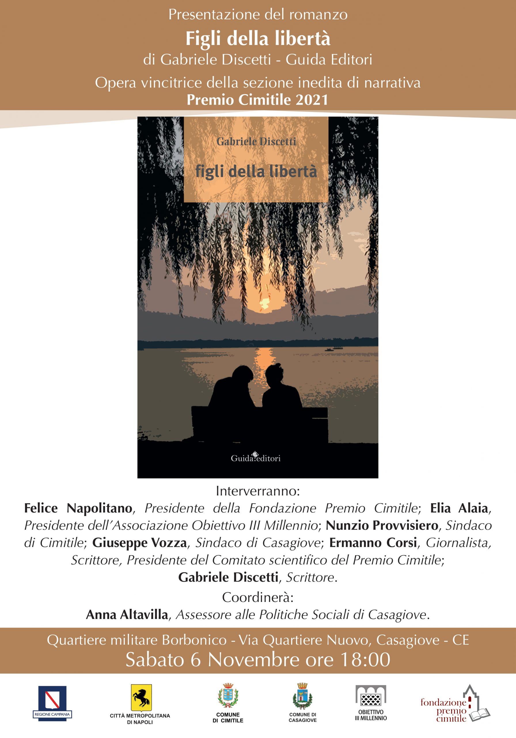 Alla serata del 6 Novembre a Casagiove, saranno presenti Felice Napolitano, Presidente della Fondazione Premio Cimitile; Elia Alaia, Presidente dell’Associazione Obiettivo III Millennio; Nunzio Provvisiero, Sindaco di Cimitile; Giuseppe Vozza, Sindaco di Casagiove; Ermanno Corsi, Giornalista, Scrittore, Presidente del Comitato scientifico del Premio Cimitile; Gabriele Discetti, Scrittore.