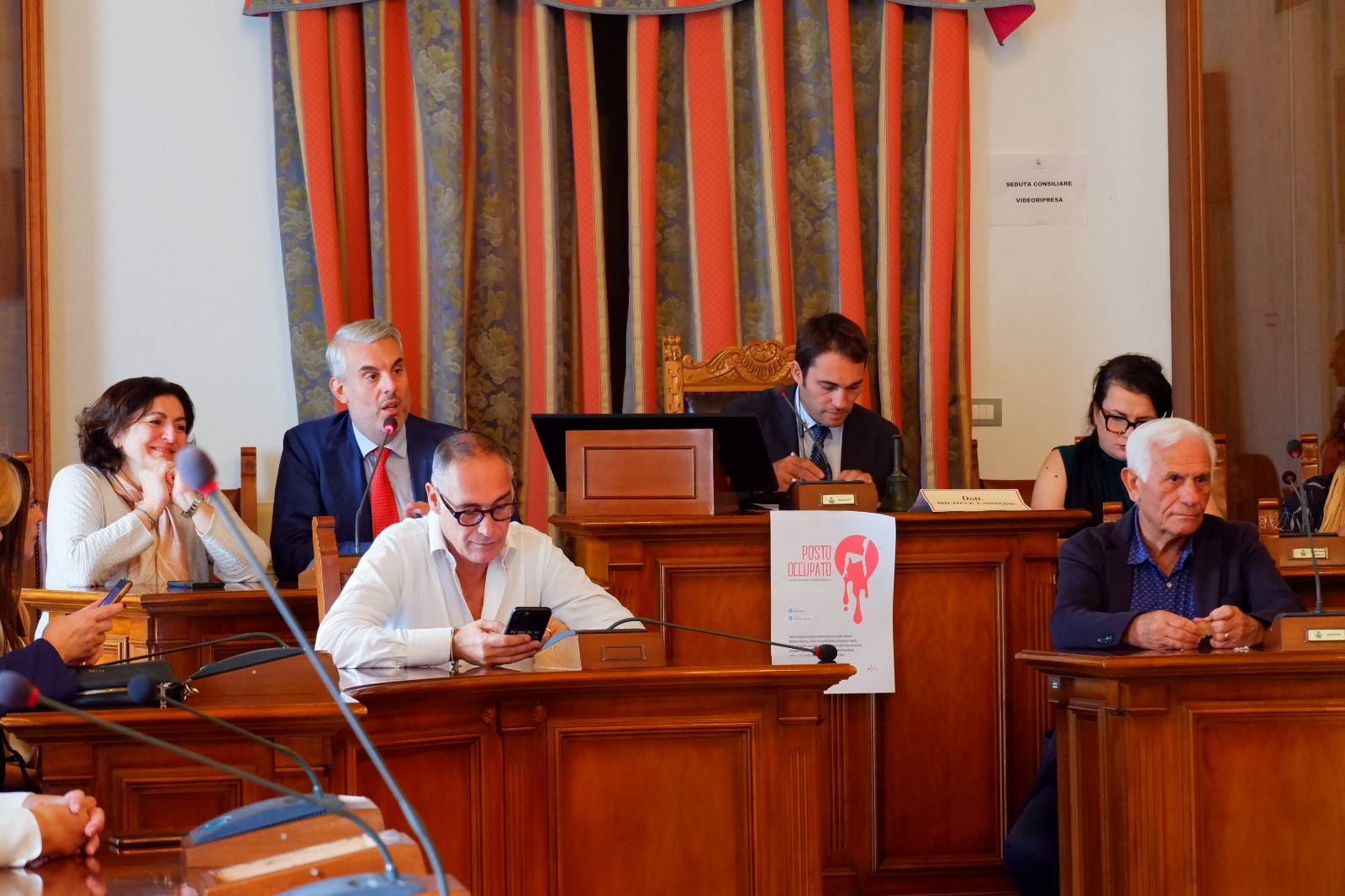 L’apposizione del cartello “posto occupato” su uno scranno del Consiglio comunale, si è svolta alla presenza del Sindaco Giorgio Zinno, dell’On. Loredana Raia, vicepresidente del Consiglio Regionale; di Ilaria Perretti, presidente della Consulta regionale per la violenza contro le donne e di Maria Andaloro, ideatrice della campagna nazionale.