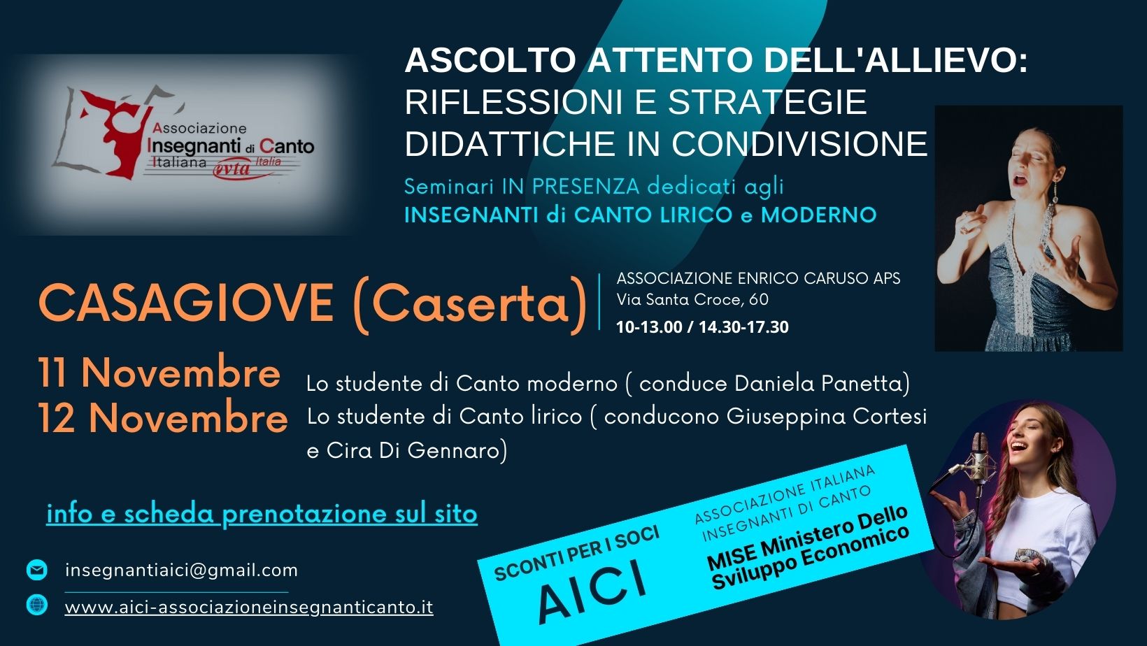 I seminari in presenza sul canto moderno e sul canto lirico sono organizzato da AICI (Associazione italiana insegnanti di canto), della quale l’Associazione “Enrico Caruso APS” è terza sede nazionale.