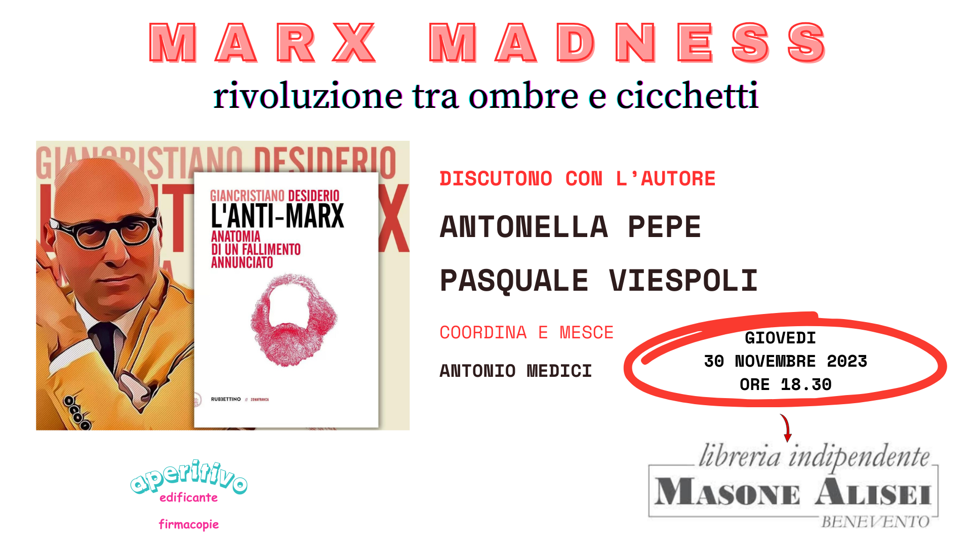 Marx Madness, rivoluzione tra ombre e cicchetti, è il titolo della serata che si terrà giovedì 30 novembre, con inizio alle 18.30, alla libreria indipendente Masone, di Benevento.