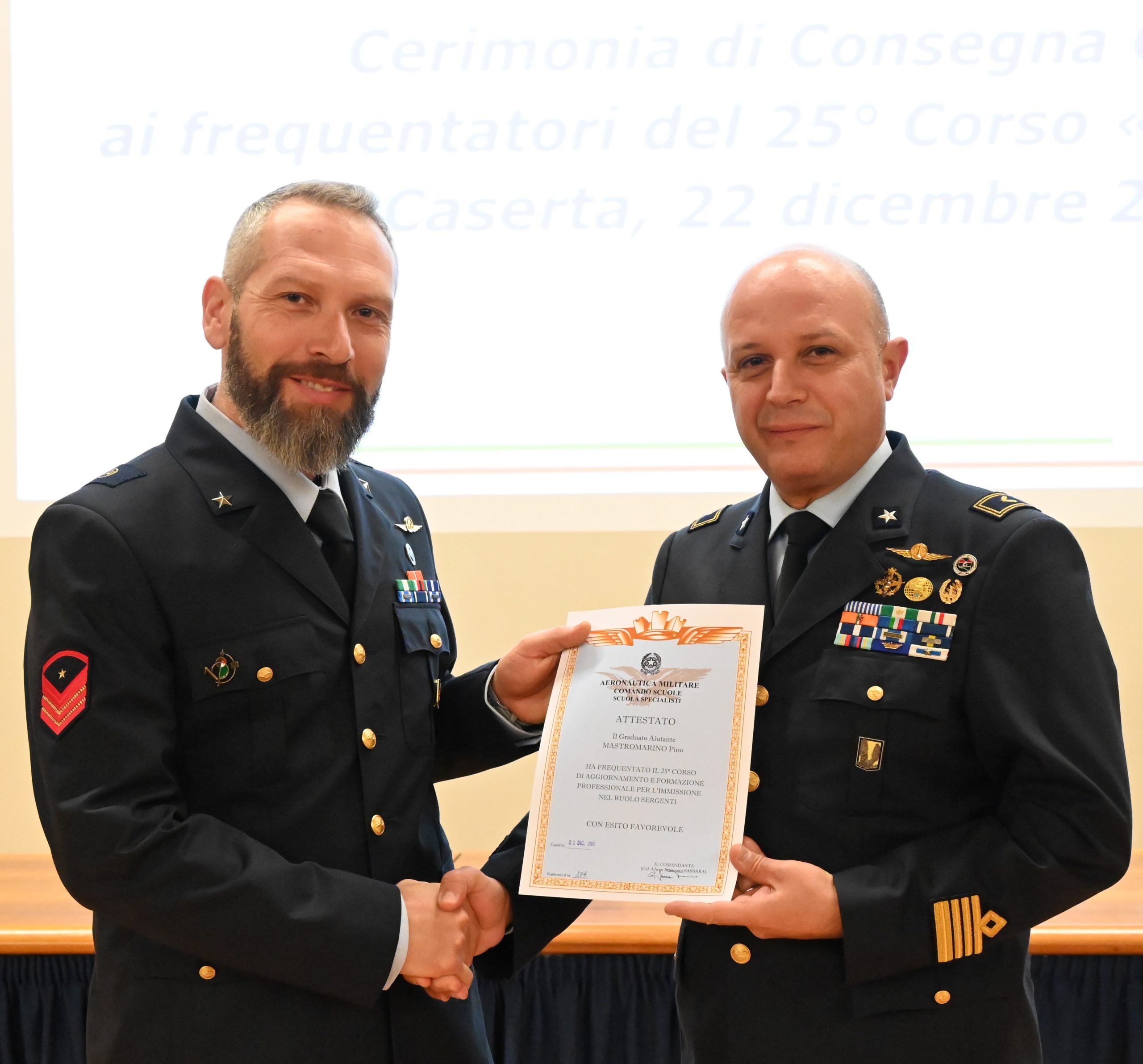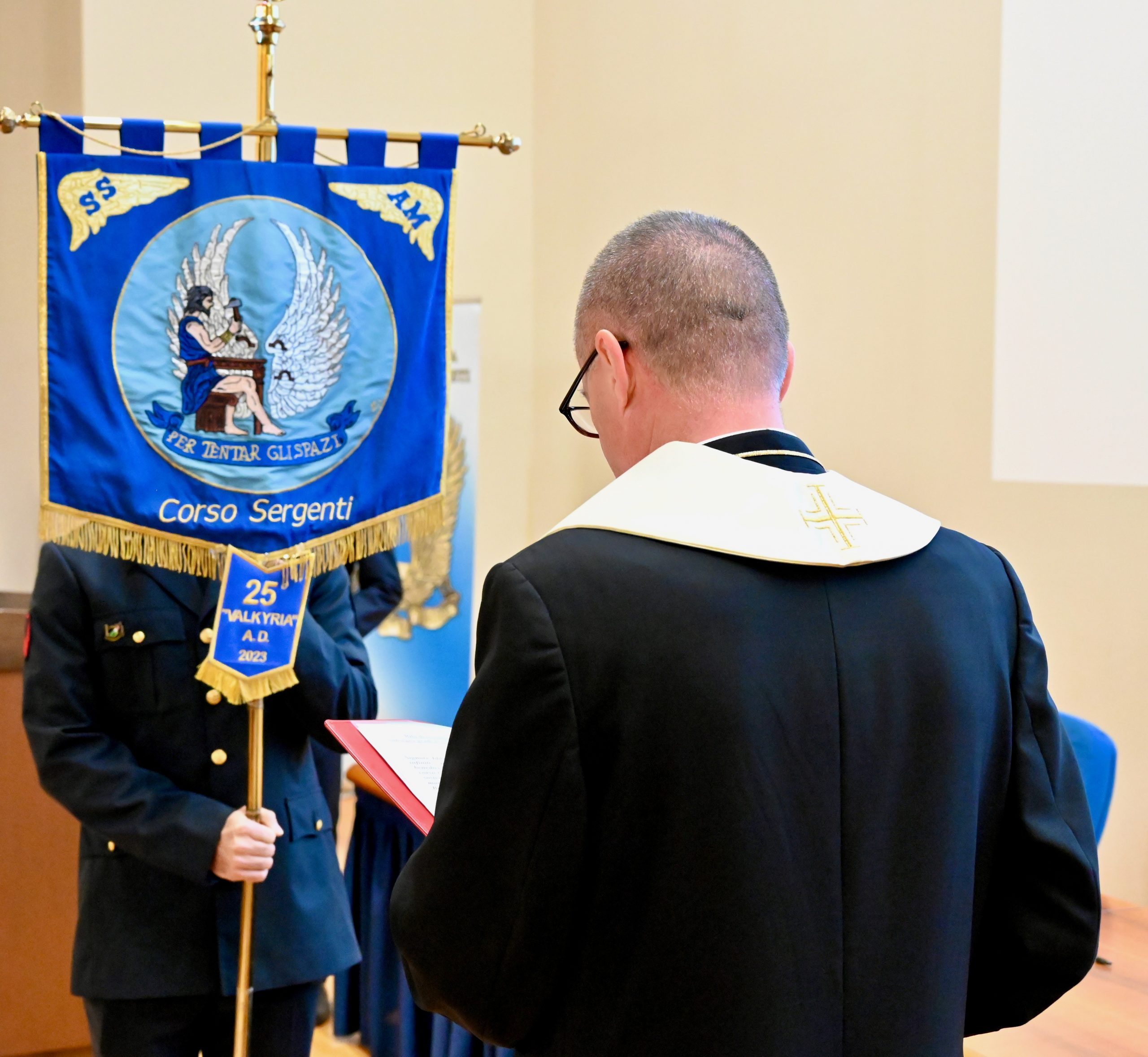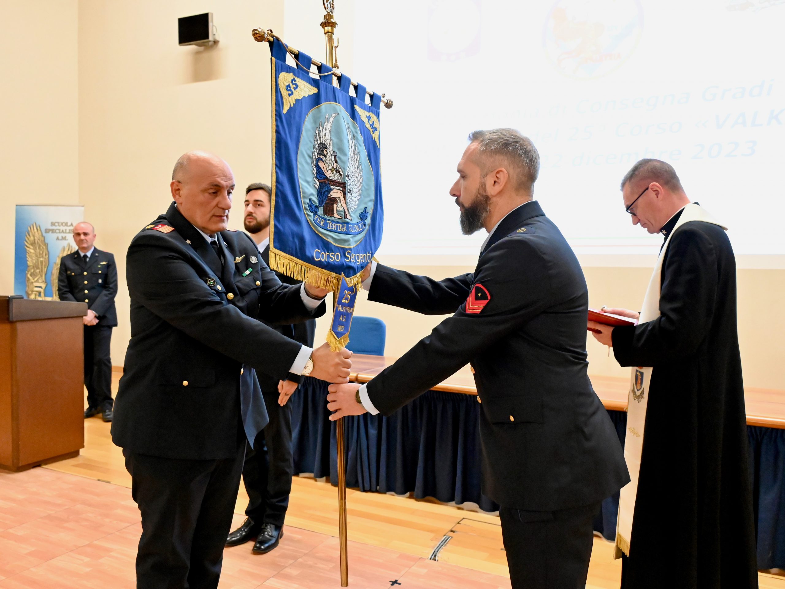 Venerdì 22 dicembre 2023, alla Scuola Specialisti dell’Aeronautica Militare di Caserta si è tenuta la cerimonia di consegna dei diplomi di immissione nel ruolo Sergenti ai frequentatori del 25° Corso “VALKYRIA”. I frequentatori hanno scelto di attribuire al 25° corso il nome “Valkyria” per la seguente motivazione: “Le Valchirie, nella mitologia norrena, sono soldati al servizio di Odino che irrompono sul campo di battaglia su cavalli alati, cavalcano a schiere, vestite d’elmo e corazza, invisibili attraverso l’aria. Oltre al loro ruolo di accompagnatrici per soldati meritevoli attraverso il vallalha al cospetto di Odino”; il motto scelto è: FIDELIS VALKYRIE TE PROTEGET! VICTORIAM TIBI DABO! Che significa: “La fedele Valchiria ti protegge! Ti donerò la vittoria!”