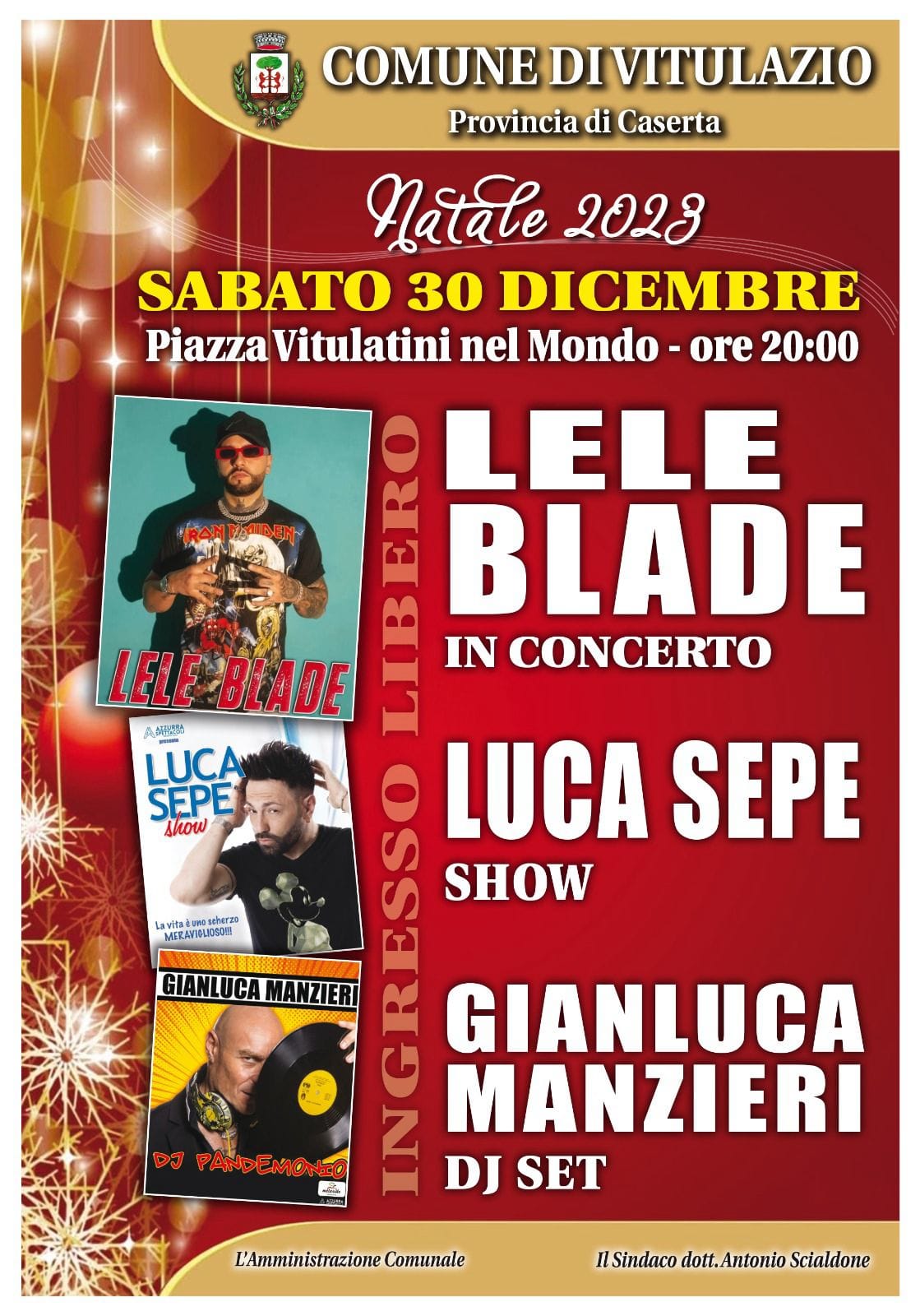 Natale 2023 – Un Natale di luci, colori, suoni e melodie. Vitulazio rinasce e si illumina è il nome del ricco calendario di eventi natalizi che ha preso il via il 21 dicembre e terminerà con l’Epifania. Una serie di iniziative destinate a bambine e bambini, ragazze e ragazzi, donne e uomini, dislocate su tutto il territorio comunale di Vitulazio volte a rallegrare il periodo più bello dell’anno. “ L’intento dell’Amministrazione è stato quello di rendere il Natale gioioso, vivo; in più ai cittadini è stato offerto un ampio e variegato insieme di proposte per promuovere la tradizione della festa più sentita dell’anno. Le manifestazioni natalizie realizzate perseguono anche l’intento di promuovere il nostro territorio”. Così il sindaco Antonio Scialdone. Al programma di eventi natalizi hanno lavorato alacremente il vice sindaco Melania Russo e l’assessore agli eventi Giusy Magliocca. Sabato 30 dicembre attesi Dj Set di Gianluca Manzieri, Luca Sepe Show, Tik Toker Rafael o Pazz ed il “Gran Concerto di Lele Blade”. L’appuntamento è nella piazza Vitulatini nel Mondo alle 20.30. Attesa anche la serata del 5 gennaio con lo “Spettacolo dei Ditelo Voi”. Previste anche altre iniziative in calendario, oltre a quelle citate, nei giorni 27, 28, 29, 31 dicembre e 1 e 6 gennaio. Un Natale di grandi emozioni a Vitulazio.