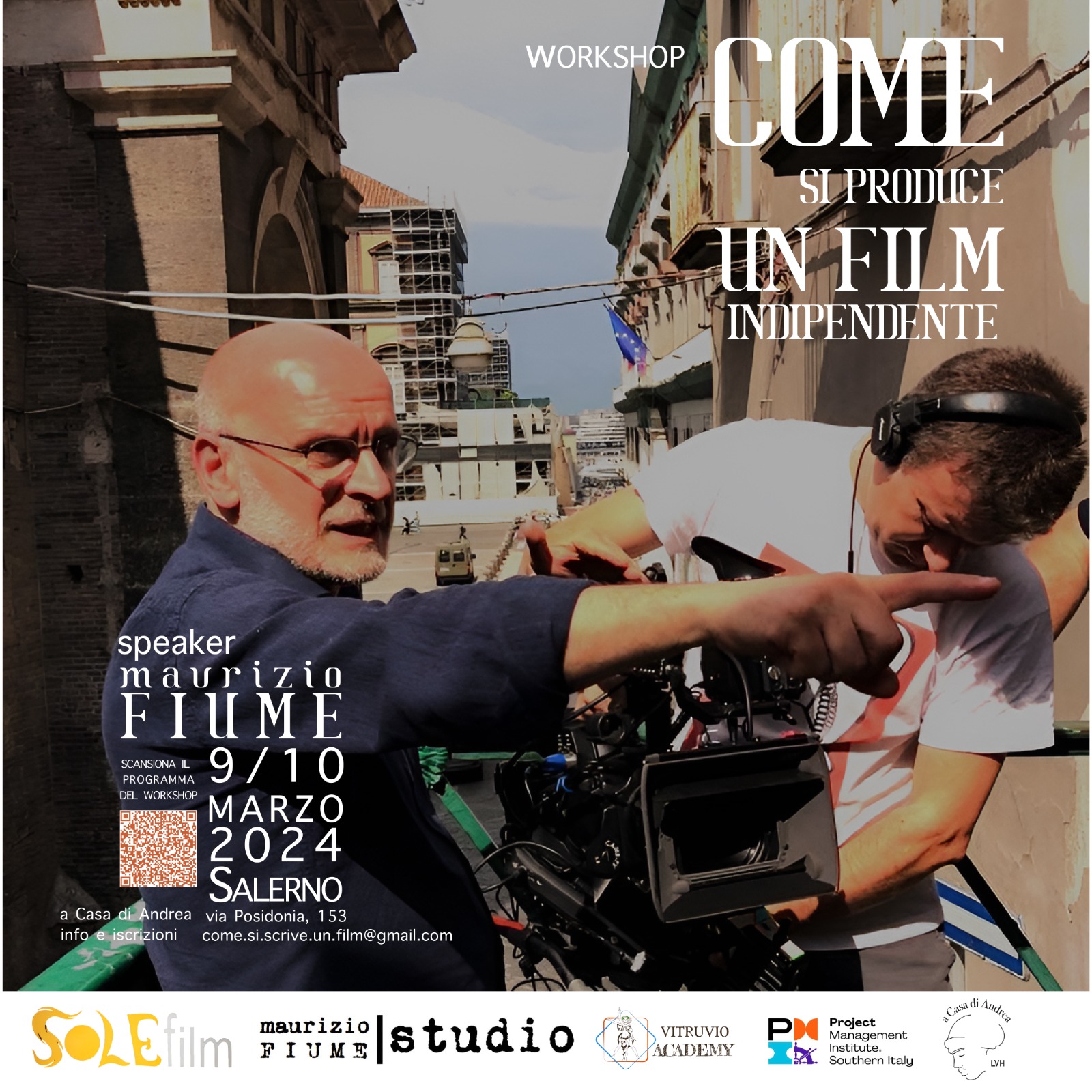 Il Workshop intitolato “COME SI PRODUCE UN FILM INDIPENDENTE anche con l’I.A”, della durata di due giorni e previsto sabato 9 e domenica 10 marzo sia in presenza (a Salerno presso l’associazione A Casa di Andrea – Via Posidonia, 153) che in diretta streaming, organizzato dalla SOLEFILM e co-organizzato dalla VITRUVIO ACADEMY, con il patrocinio del PMI Southern Italy Chapter, è rivolto a coloro che intendono operare nel settore delle imprese di produzione cinematografica indipendente in qualità di assistenti di produzione, junior Project Manager, junior executive producer. Il workshop è destinato a under 40 che vogliono realmente lavorare nella produzione cinematografica e intraprendere un itinerario di conoscenza ed esperienza – full immersion – nel campo della realizzazione filmica, finalizzato alla realizzazione di un lungometraggio.