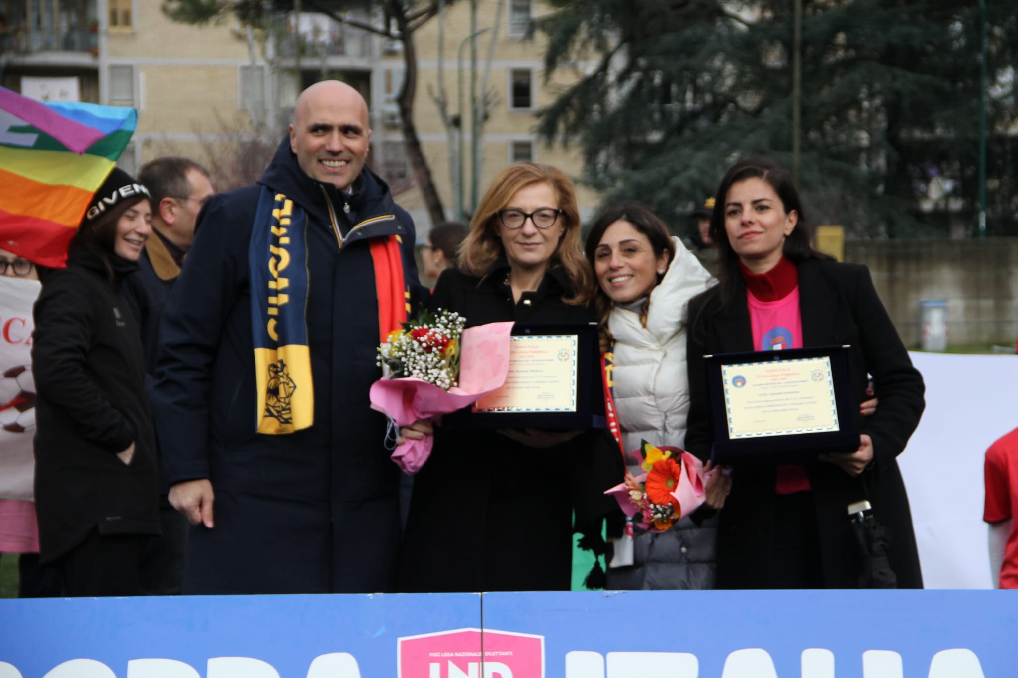 Presenti, con il presidente della consulta della Municipalità Vincenzo Paradisone, le associazioni Le Ali di Scampia, Gli Arcieri, Dream Team, Senza Confini, Universal Center, Judo Maddaloni, Uomo e Legno, Doulos Servo, Fondazione Celus, Banda Baleno. Con loro anche l’associazione Braccialetti Rosa, in campo contro la violenza delle donne e da sempre a sostegno della finale regionale Coppa Italia Dilettanti Femminile. Presenti anche le società di calcio del territorio Gioventù Partenope, Arci Scampia, Oratorio Don Guanella, Stella Rossa Duemilasei. Ai ragazzi dell’associazione Sogno di Scampia, infine, il Comitato Regionale Campania FIGC LND ha donato completini, borsoni e palloni, consegnati prima della partita dal presidente Zigarelli.