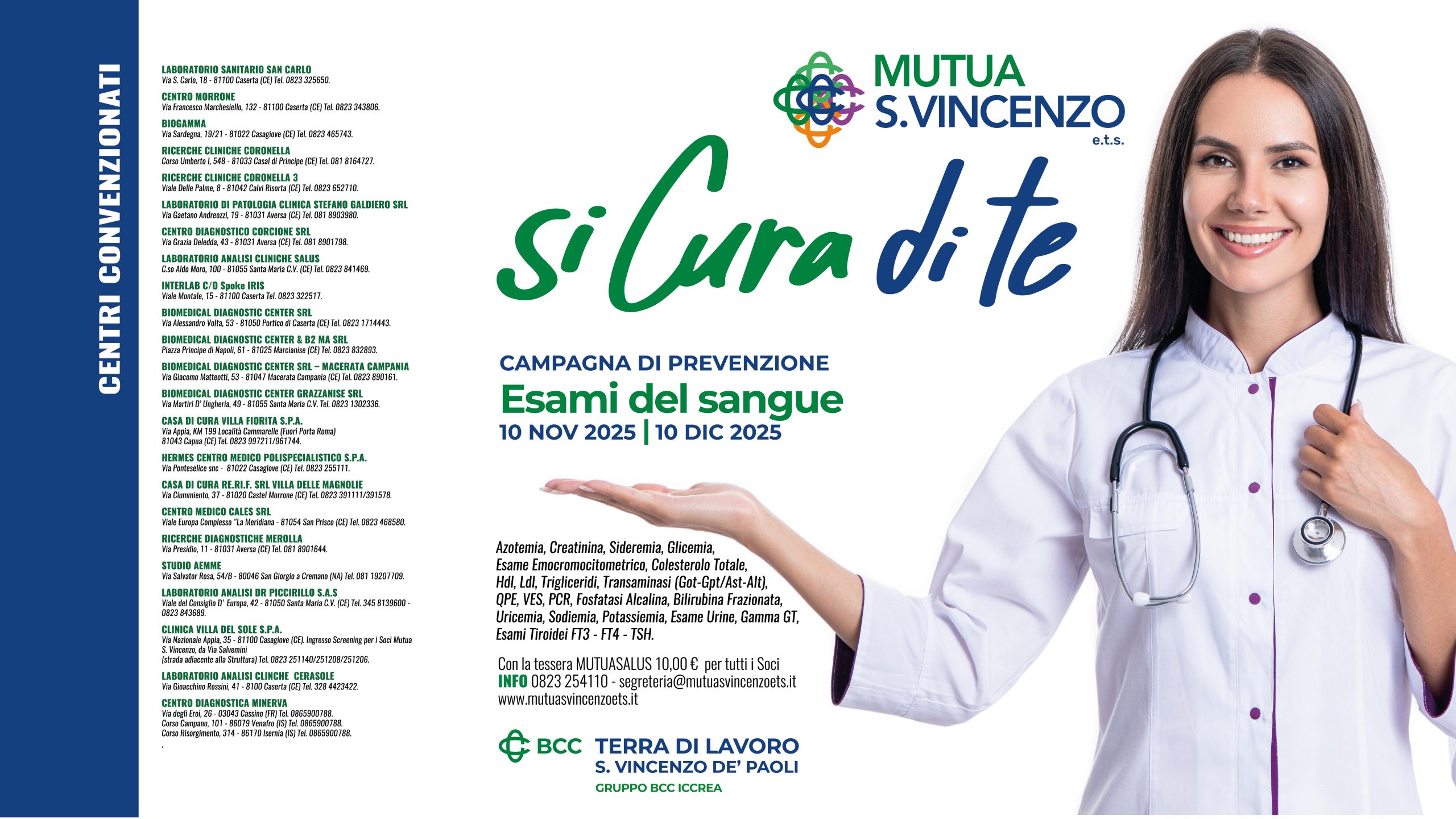 Casagiove (Caserta). Prenderà il via il 10 novembre 2025 la nuova campagna di prevenzione sanitaria promossa dalla Mutua S. Vincenzo e.t.s., dal titolo “Si Cura di Te”, dedicata agli esami del sangue a tariffa agevolata per tutti i soci della BCC Terra di Lavoro S. Vincenzo de’ Paoli. L’iniziativa, che proseguirà fino al 10 dicembre 2025, punta a diffondere la cultura della prevenzione e della cura attraverso un accesso semplice, economico e diffuso ai servizi sanitari di base.