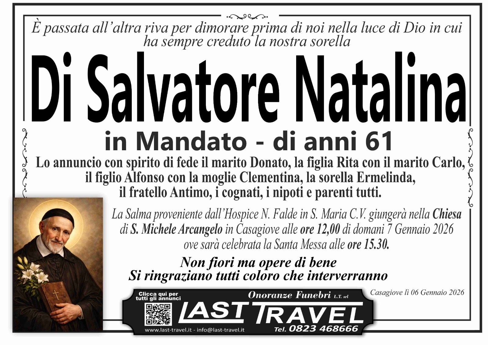 La comunità di Casagiove è in lutto per la scomparsa di Natalina Di Salvatore in Mandato, di anni 61, insegnante stimata e donna di profonda fede, venuta a mancare dopo una lunga e dolorosa lotta contro una grave malattia, affrontata con dignità, coraggio e totale affidamento a Dio.