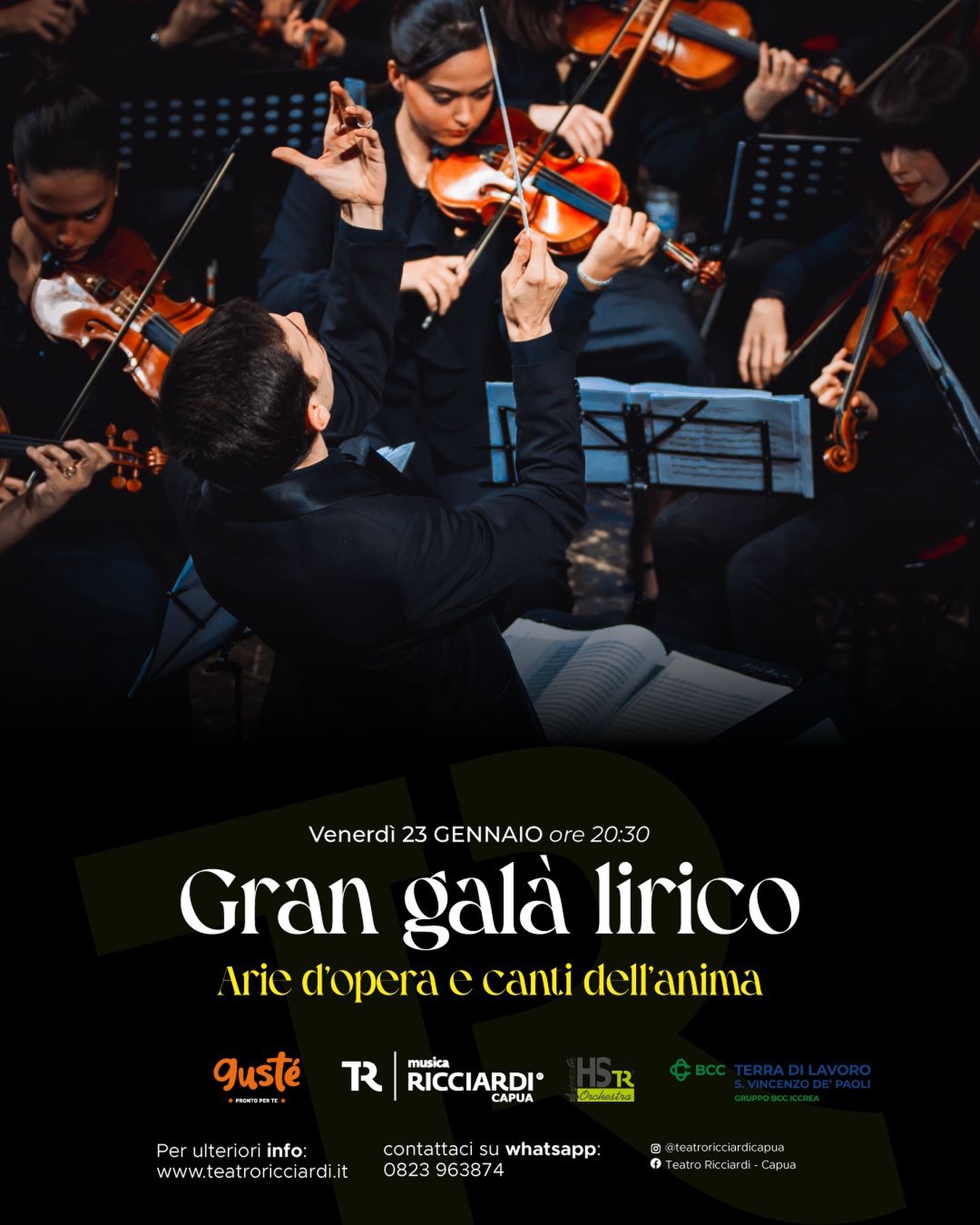 “Gran Galà Lirico” Arie d’opera e canti dell’anima. Il 23 gennaio un evento unico al Teatro Ricciardi di Capua. Un appuntamento imperdibile con la Heart Sound Orchestra diretta dal maestro Domenico Rocco, per chi ama l’opera, la bellezza del suono dal vivo e l’intensità delle emozioni che solo la musica sa regalare. Le grandi arie della tradizione lirica si intrecciano a melodie senza tempo, guidate dalla potenza dell’orchestra e dalla forza espressiva delle voci. Un concerto che unisce alcune delle pagine più celebri e coinvolgenti del repertorio lirico e sinfonico con le affascinanti melodie della canzone classica napoletana. Il programma è concepito per catturare le emozioni di un pubblico ampio e trasversale, con una selezione musicale accessibile ma di alto valore artistico. Questo spettacolo ha già conquistato il pubblico in precedenti occasioni, riscuotendo un grande successo anche al Teatro Ricciardi di Capua. Sul palco, ben 40 orchestrali accompagnano due solisti di indubbio valore artistico, il soprano Alessia Di Cicco e il tenore Giuseppe Di Lorenzo. È un’esperienza intensa, con un’alternanza ben studiata di arie d’opera, duetti, canzoni classiche napoletane e brani orchestrali noti e sicuramente coinvolgenti.