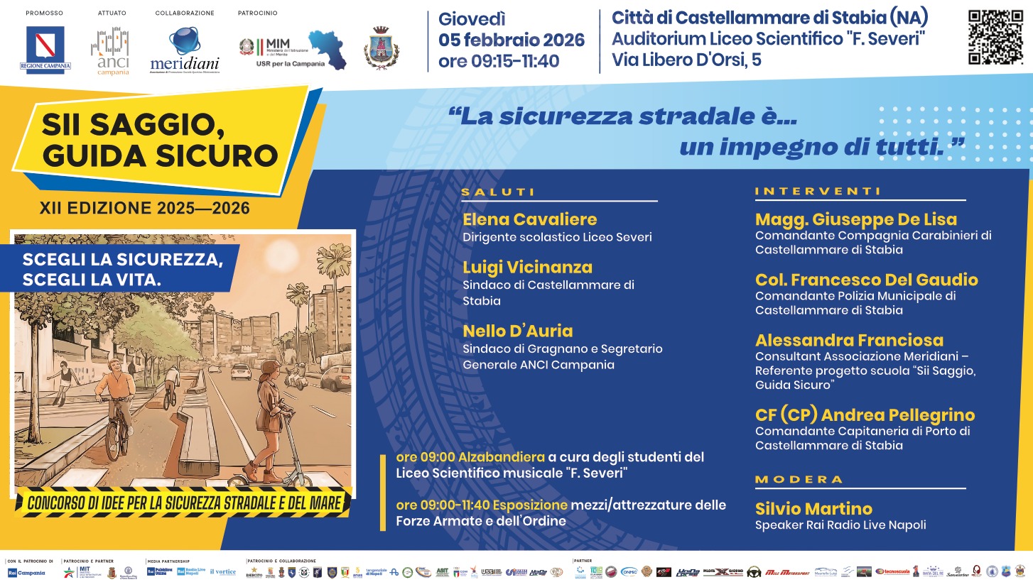 Giovedì 5 febbraio, l’Aula magna del Liceo Severi di Castellammare di Stabia ospiterà la diciannovesima tappa della campagna di sensibilizzazione “Sii Saggio, Guida Sicuro”, promossa dall’Associazione Meridiani – APSSD con lo slogan “Scegli la sicurezza, scegli la vita”.