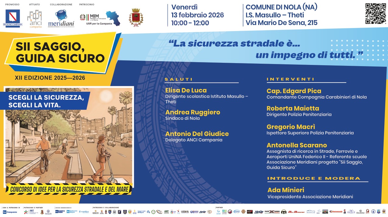 La ventunesima tappa del roadshow itinerante sulla sicurezza stradale e del mare denominato #siisaggioguidasiuro, farà tappa domani 13 febbraio alle ore 10:00, presso l’Istituto Masullo – Theti di Nola presieduto da Elisa De Luca, e a cui prenderanno parte Andrea Ruggiero, Sindaco di Nola, Antonio Del Giudice, Delegato ANCI Campania, il capitano Edgard Pica, Comandante Compagnia Carabinieri di Nola, Roberta Maietta e Gregorio Macrì della Polizia Penitenziaria. Per l’Associazione Meridiani saliranno in cattedra il vicepresidente Ada Minieri e Antonella Scarano, assegnista di ricerca in Strade, Ferrovie e Aeroporti UniNA Federico II.