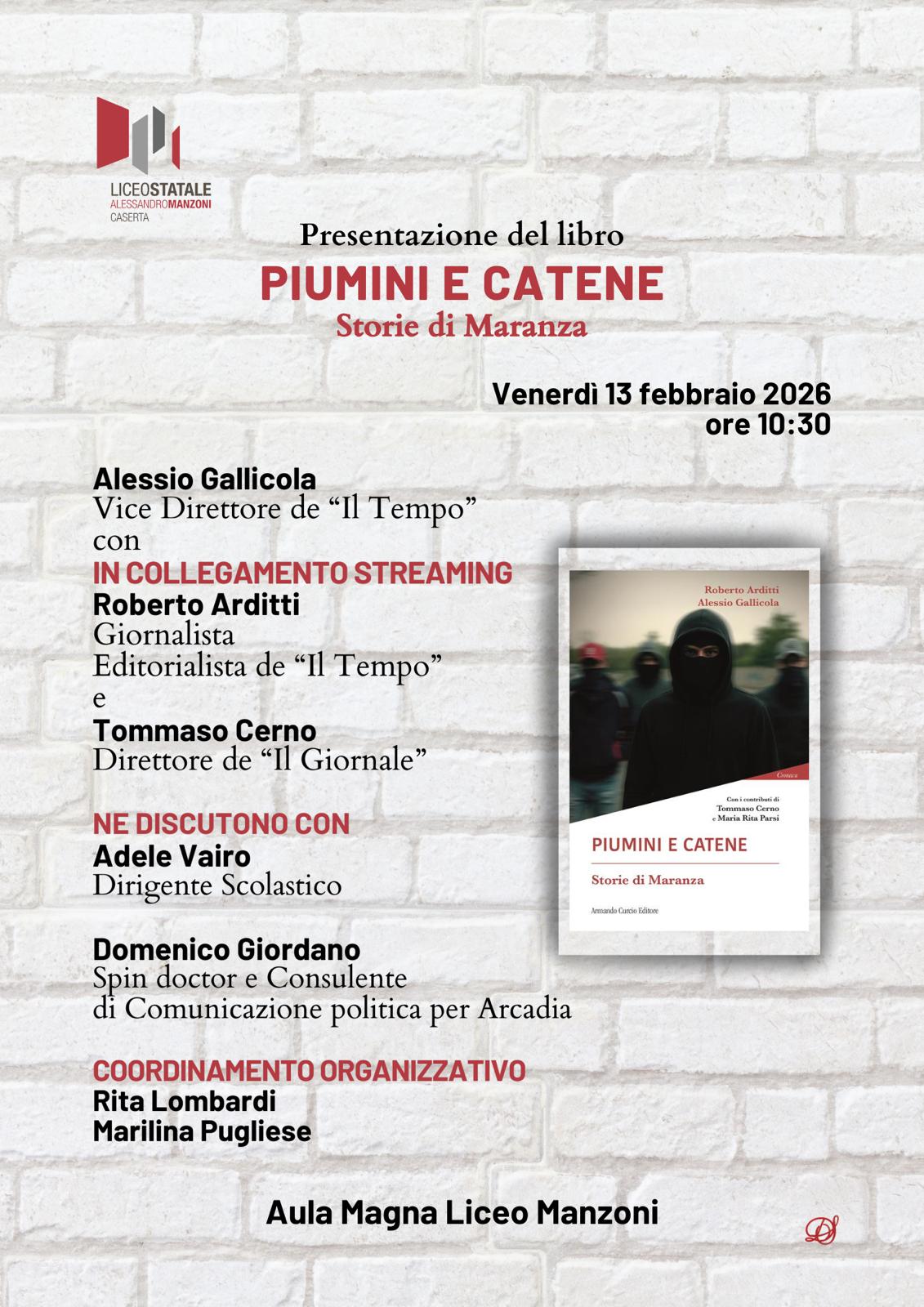 Piumini e Catene , storie di Maranza. Venerdì 13 gennaio 10.30 Aula Magna Liceo Manzoni. I giornalisti Alessio Gallicola e Roberto Arditti ne discutono con Adele Vairo – Dirigente Scolastico, Domenico Giordano – Spin doctor e Consulente di Comunicazione politica per Arcadia. Coordinamento Organizzativo prof.sse Rita Lombardi e Marilina Pugliese.